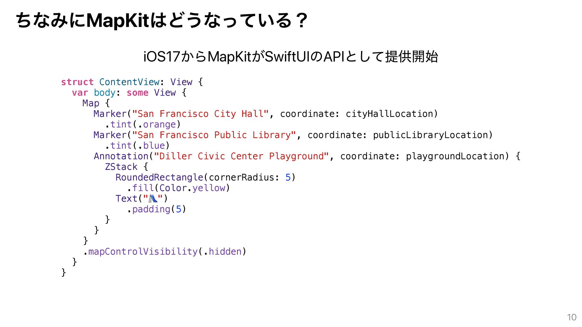iOSアプリを作る際にSwiftUIを使うことで、宣言的にコードベースでUIを作成しながらアプリを作ることができます。iOSアプリにおいては、MapKitが2023年にSwiftUIで対応したことにより、宣言的にマップを定義することができました。