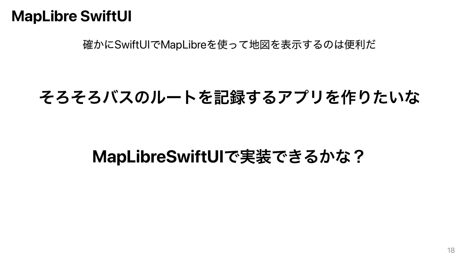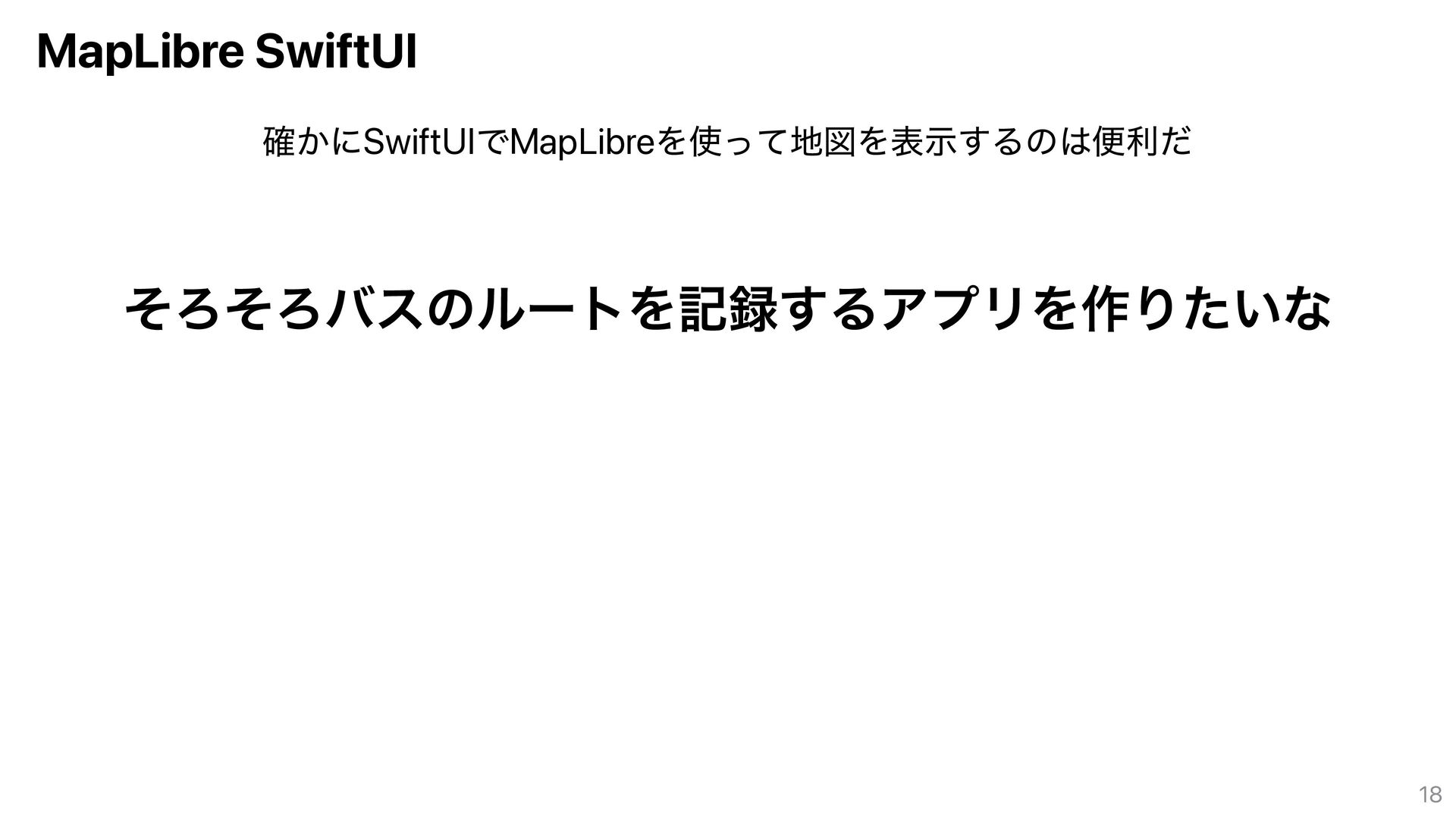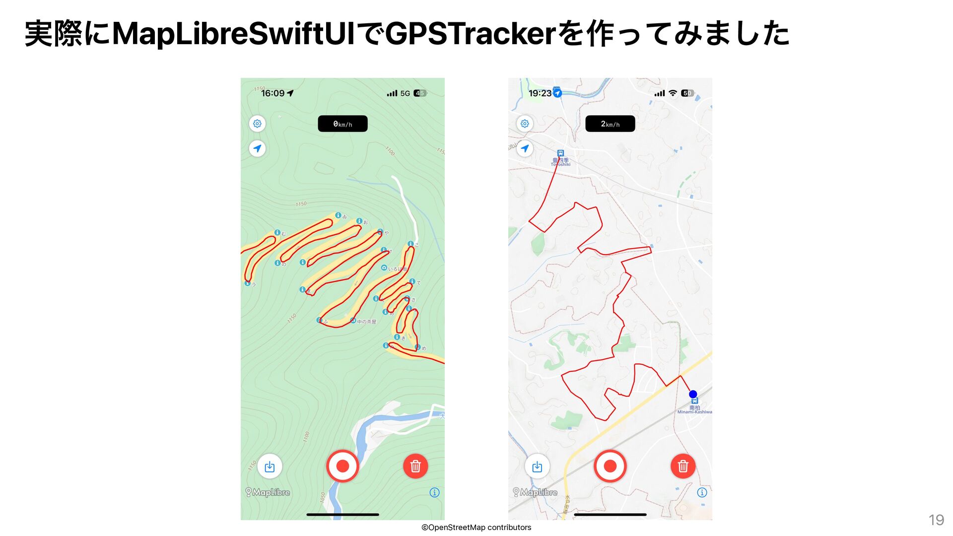 このプレゼンテーションでは、MapLibre SwiftUIを使ってGPSトラッキングアプリケーションを作ってみましたので、それを基にMapLibre SwiftUIのTipsを共有したいと思います。