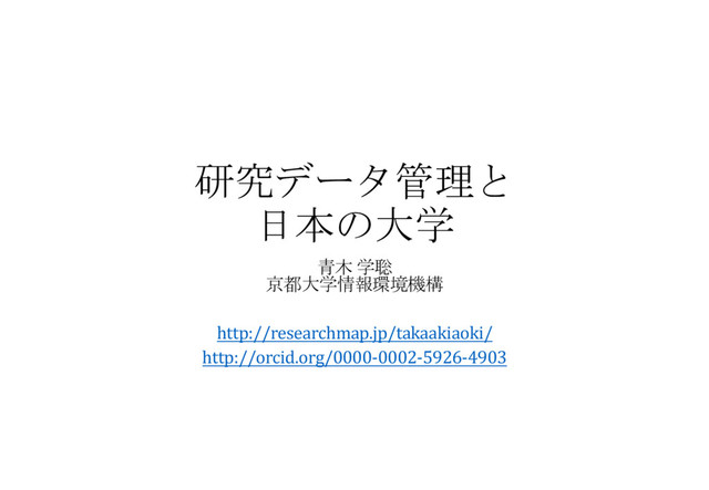 KEGG: Kyoto Encyclopedia of Genes and Genomes (化学研究所) • www.genome.jp/kegg • World Data Center for Geomagnetism, Kyoto (理学研究科) • http://wdc.kugi.kyoto-u.ac.jp/index.html • 地域研究統合DB • http://www.cias.kyoto-u.ac.jp/database/ • Etc. etc… 青木学聡, “研究データ管理と日本の大学” 第5回KYOTOオープンサイエンス勉強会 (2016/10/19)