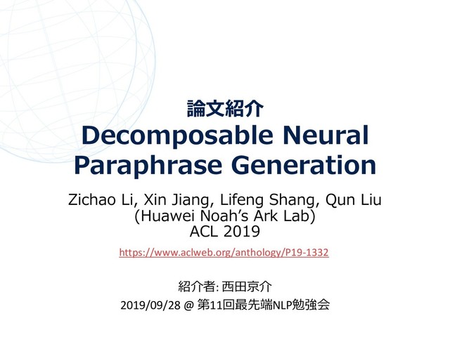 論⽂紹介 Decomposable Neural Paraphrase Generation Zichao Li, Xin Jiang, Lifeng