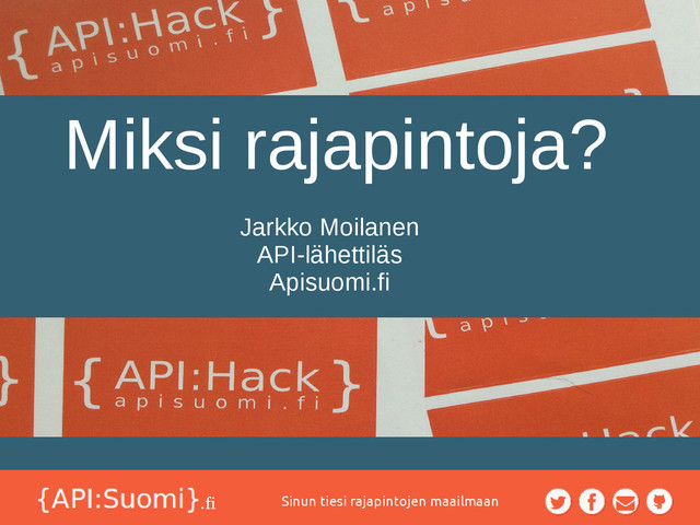 Mobiili app markkinat räjähtäneet käsiin (Apple, Google) • Yritykset jotka agressiivisesti siirtyneet API:n käyttöön tehneet hyvää tulosta (Salesforce.com) • Keväästä 2013 Isot toimijat hankkineet API:en halllintaratkaisuja (Mashery, Layer 7) • Julkinen sektori on konkreettisesti alkanut promotoida rajapintoja
