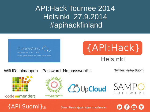 palvelijat ja jatkuvuus jatkuvuus • Yhteisön polttoaineen muodostaa vapaaehtoiset API -lähettiläät, jotka: • levittävät tietoa erilaisista rajapinnoista, hyvistä rajapintakäytänteistä, • aktivoivat ja inspiroivat kehittäjiä käyttämään rajapintoja, • järjestävät API -tapahtumia eri puolilla Suomea, • edesauttavat uusien (avoimien) rajapintojen luomista • http://apisuomi.fi/suomen-api-lahettilaat/ • Tällä hetkellä 6 rohkeaa API -samuraita • Liity mukaan!