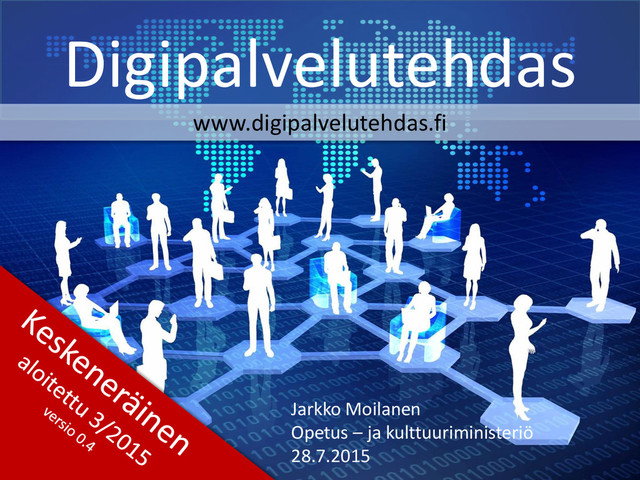 Software, B105, Exove, Futurice, Sirdar… • Ensimmäiset projektit liikkeelle 9/2015 • Julkaisukanava –projekti liikkeelle yhteistyössä VRK, JulkICT lab, Valtori – tarvitaan vuoden vaihteesta (2016) eteenpäin • Lisää muita virastoja mukaan kehittämään