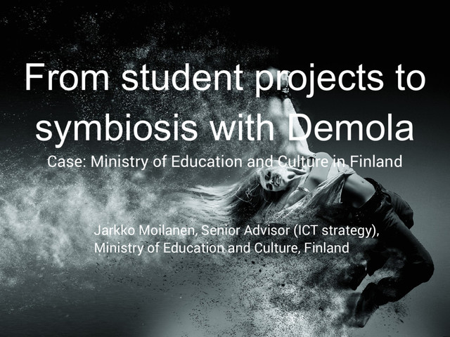 just ICT Preparing new legislation, internal processes and tools Demola will live inside ministry, beyond symbiosis As model for internal startup Use Demola as platform for cross-border co- operation Ecosystem of staff and projects via partners Ideas from field, anyone can pick idea