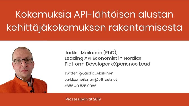 APIen ensisijainen asiakas on sovelluskehittäjä. Tästä varmaan moni on samaa mieltä, mutta mitä se käytännössä tarkoittaa ja miten se toimialan parhaan kehittäjäkokemuksen tarjoava API ja alusta tehdään? Esityksessä kerron kokemuksista aiheeseen liittyen viimeisen 6 kuukauden ajalta Platform of Trust -alustan kohdalla. Esitys sisältää käytännönläheistä asiaa innostavien ja suorapuheisten tarinoiden muodossa. Mukana myös aiheesta tehtyjen tutkimusten tuloksia tukemassa ja perustelemassa tehtyjä ratkaisuja. Loistavan kehittäjäkokemuksen suunnittelu ja toteutus on maratoni eikä 110 metrin aidat. Matkalla tulee vastaan tilanteita joihin on sopeuduttava ja ratkaisut pitää rakentaa asiakaslähtöisesti ilman turhaa markkinointihöttöä. Matka vaatii kestävyyttä ja ketteryyttä. Esityksestä saat vinkkejä miten selvitä maratonin maaliviivalle. Esitys on suunnattu ensisijaisesti APIen ja alustojen kehityksestä ja myynnistä, kehittäjäkokemuksesta (DX) ja asiakaskokemuksesta (CX) vastaaville henkilöille.