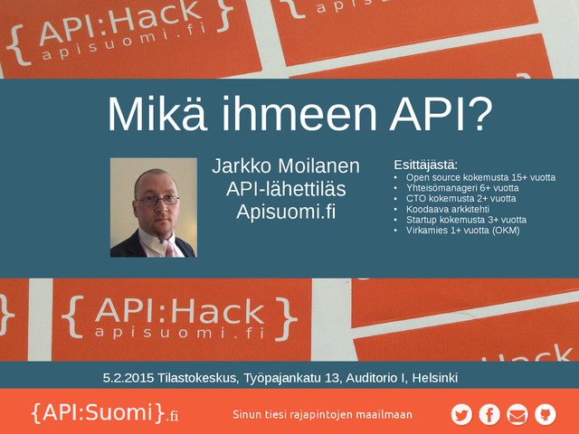 ihmeen API? Jarkko Moilanen API-lähettiläs Apisuomi.fi Esittäjästä: • Open source kokemusta 15+ vuotta • Yhteisömanageri 6+ vuotta • CTO kokemusta 2+ vuotta • Koodaava arkkitehti • Startup kokemusta 3+ vuotta • Virkamies 1+ vuotta (OKM) 5.2.2015 Tilastokeskus, Työpajankatu 13, Auditorio I, Helsinki