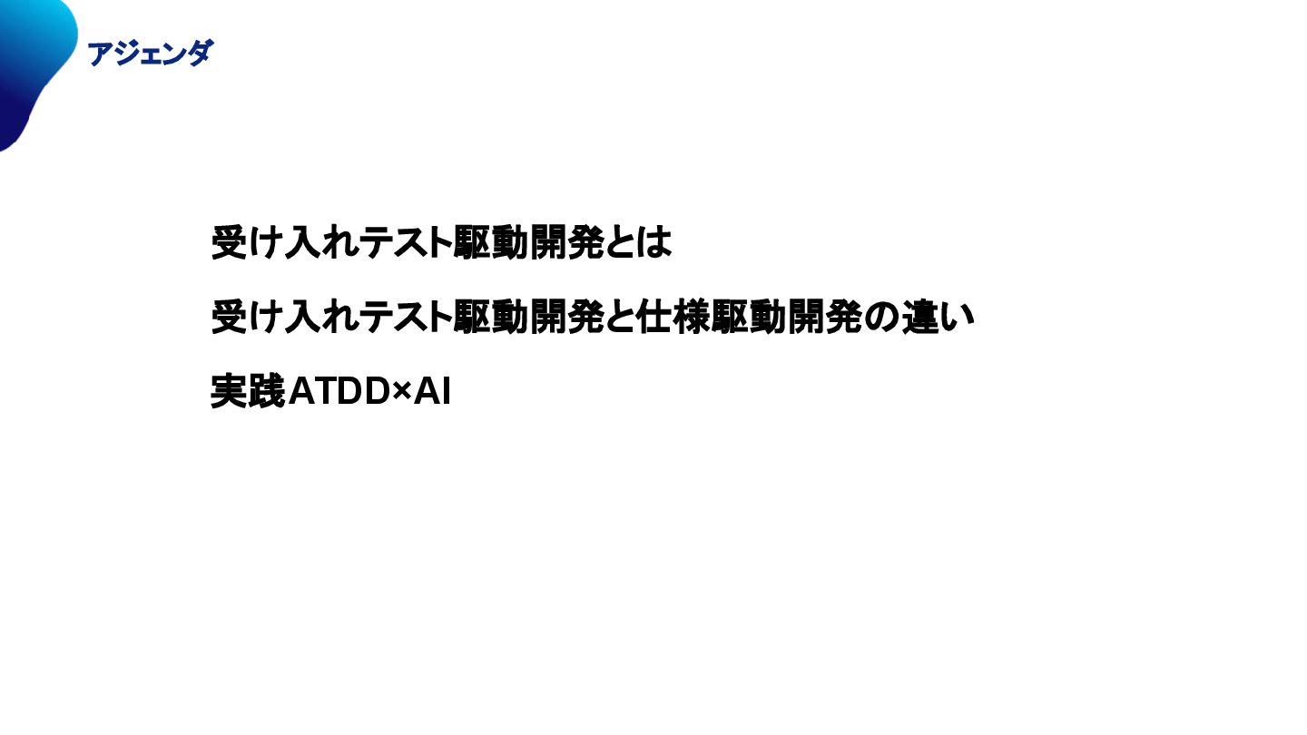 アジェンダ 受け入れテスト駆動開発とは 受け入れテスト駆動開発と仕様駆動開発の違い 実践ATDD×AI
