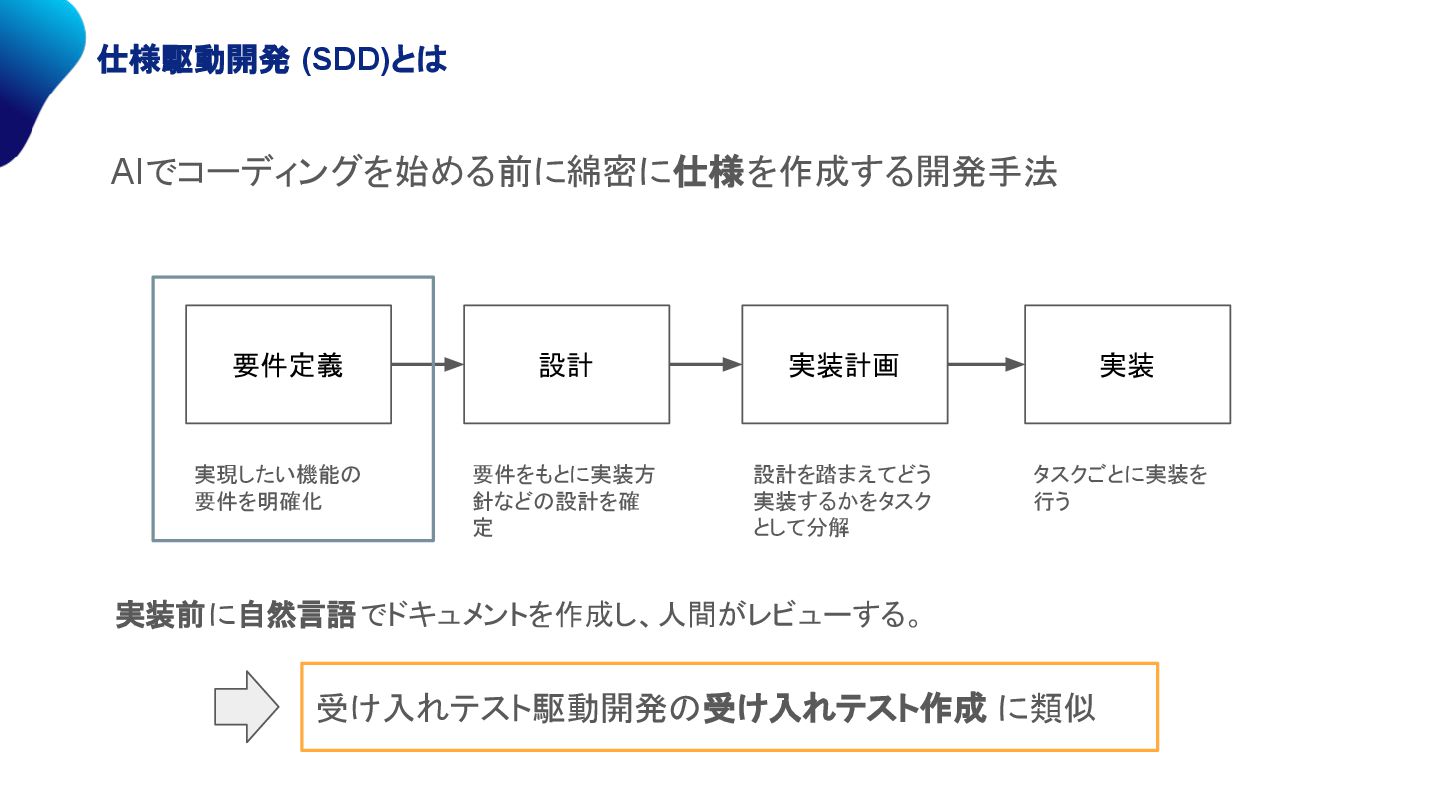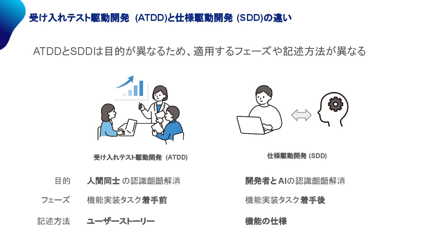 受け入れテスト駆動開発 (ATDD)と仕様駆動開発 (SDD)の違い 人間同士 の認識齟齬解消 開発者と AIの認識齟齬解消 ATDDとSDDは目的が異なるため、適用するフェーズや記述方法が異なる 目的 フェーズ