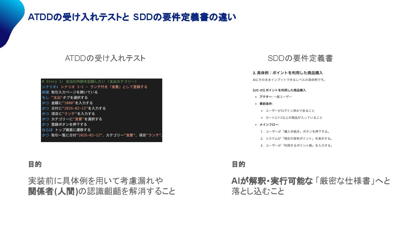 ATDDの受け入れテストと SDDの要件定義書の違い ATDDの受け入れテスト SDDの要件定義書 実装前に具体例を用いて考慮漏れや 関係者(人間)の認識齟齬を解消すること 目的 AIが解釈・実行可能な 「厳密な仕様書」へと 落とし込むこと
