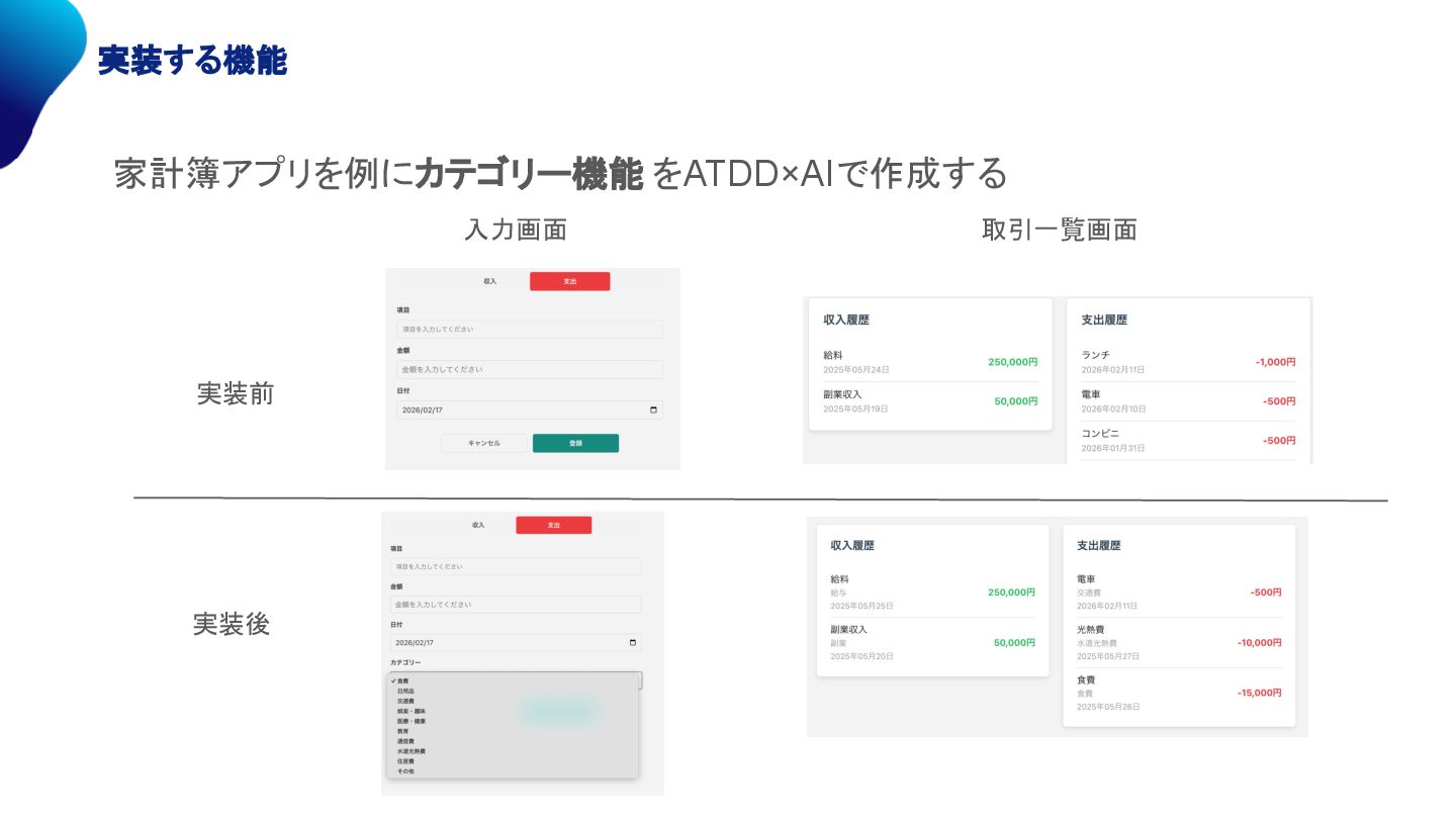 実装する機能 実装前 実装後 入力画面 取引一覧画面 家計簿アプリを例にカテゴリー機能 をATDD×AIで作成する