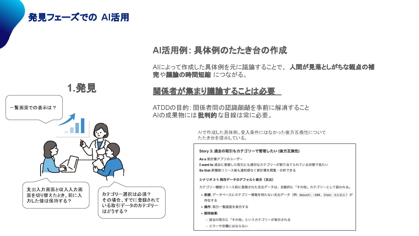 ATDDの目的: 関係者間の認識齟齬を事前に解消すること AIの成果物には批判的 な目線は常に必要。 AIで作成した具体例。受入条件にはなかった後方互換性について たたき台を提示している。 一覧画面での表示は? カテゴリー選択は必須? その場合、すでに登録されて いる取引データのカテゴリー はどうする? 支出入力画面と収入入力画 面を切り替えたとき、前に入 力した値は保持する?