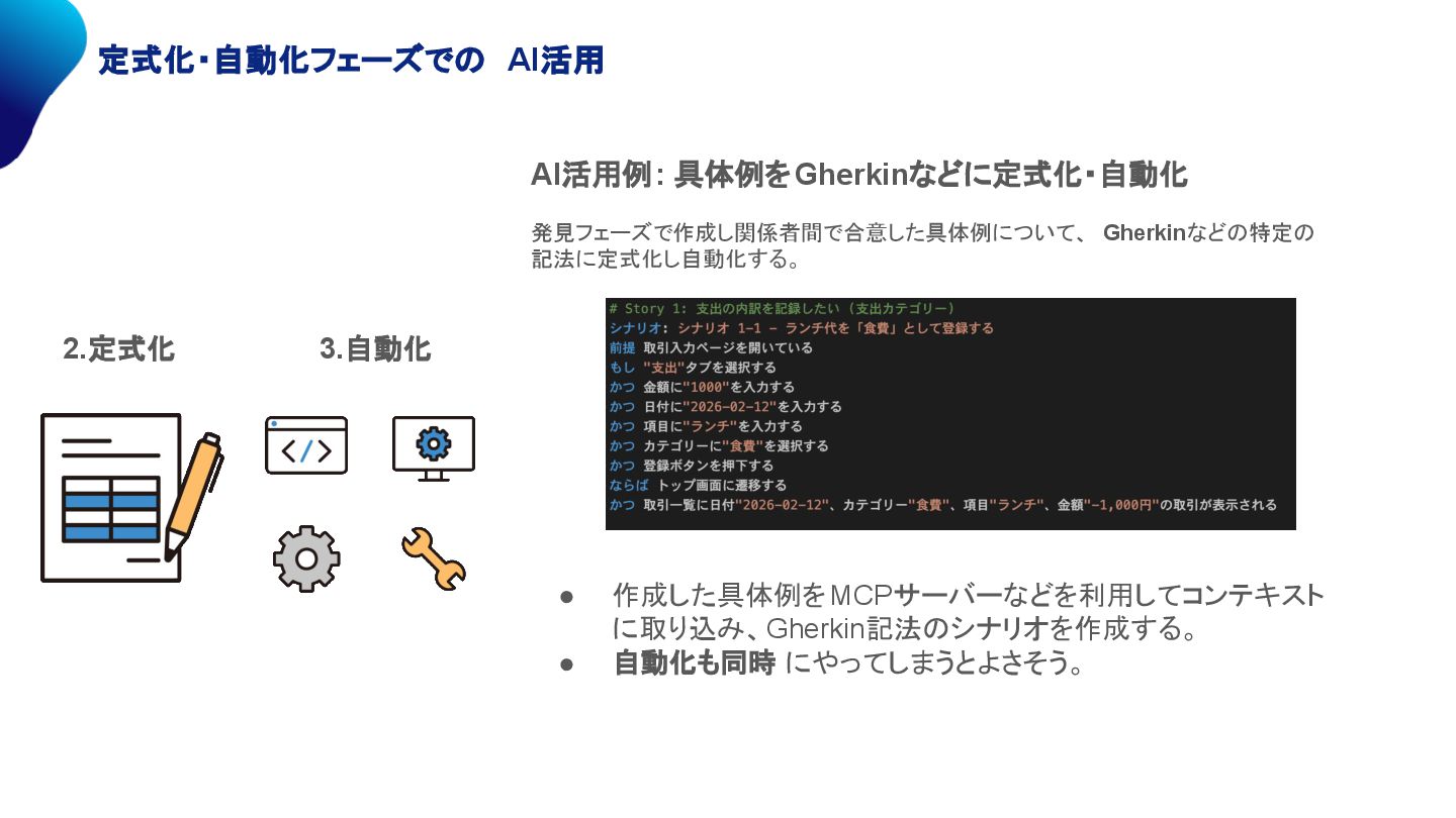 定式化・自動化フェーズでの AI活用 AI活用例: 具体例をGherkinなどに定式化・自動化 発見フェーズで作成し関係者間で合意した具体例について、 Gherkinなどの特定の 記法に定式化し自動化する。 • 作成した具体例をMCPサーバーなどを利用してコンテキスト に取り込み、Gherkin記法のシナリオを作成する。