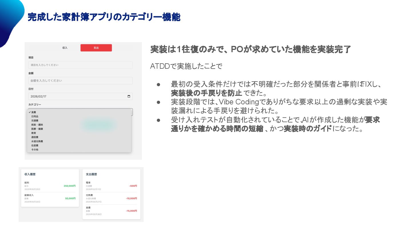 完成した家計簿アプリのカテゴリー機能 実装は1往復のみで、 POが求めていた機能を実装完了 ATDDで実施したことで • 最初の受入条件だけでは不明確だった部分を関係者と事前に FIXし、 実装後の手戻りを防止できた。 • 実装段階では、Vibe