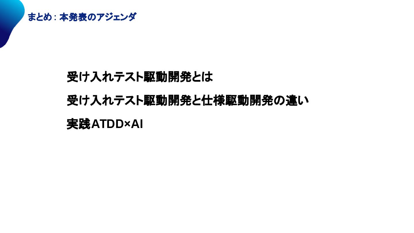 まとめ: 本発表のアジェンダ 受け入れテスト駆動開発とは 受け入れテスト駆動開発と仕様駆動開発の違い 実践ATDD×AI