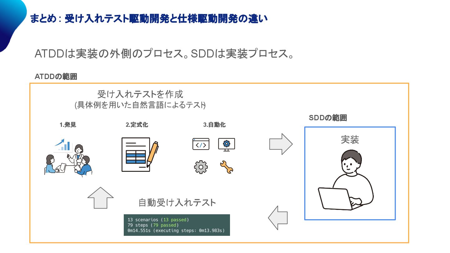 る。 ※単に「このシナリオが合格するように実装して」という指示だけだと、フロントエンド上は 満たしていても値がデータベースに保存されていない、ということも起こり得るため、普通 のAIコーディングのように具体的な指示は必要。 ATDDの実装フェーズにおける方法はTDDが推奨だが、 手段は自由。 ここでSDDを用いることもできる。