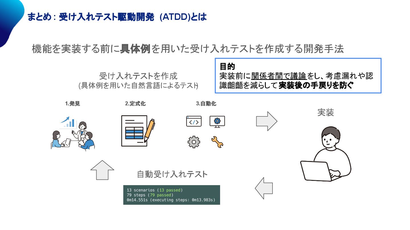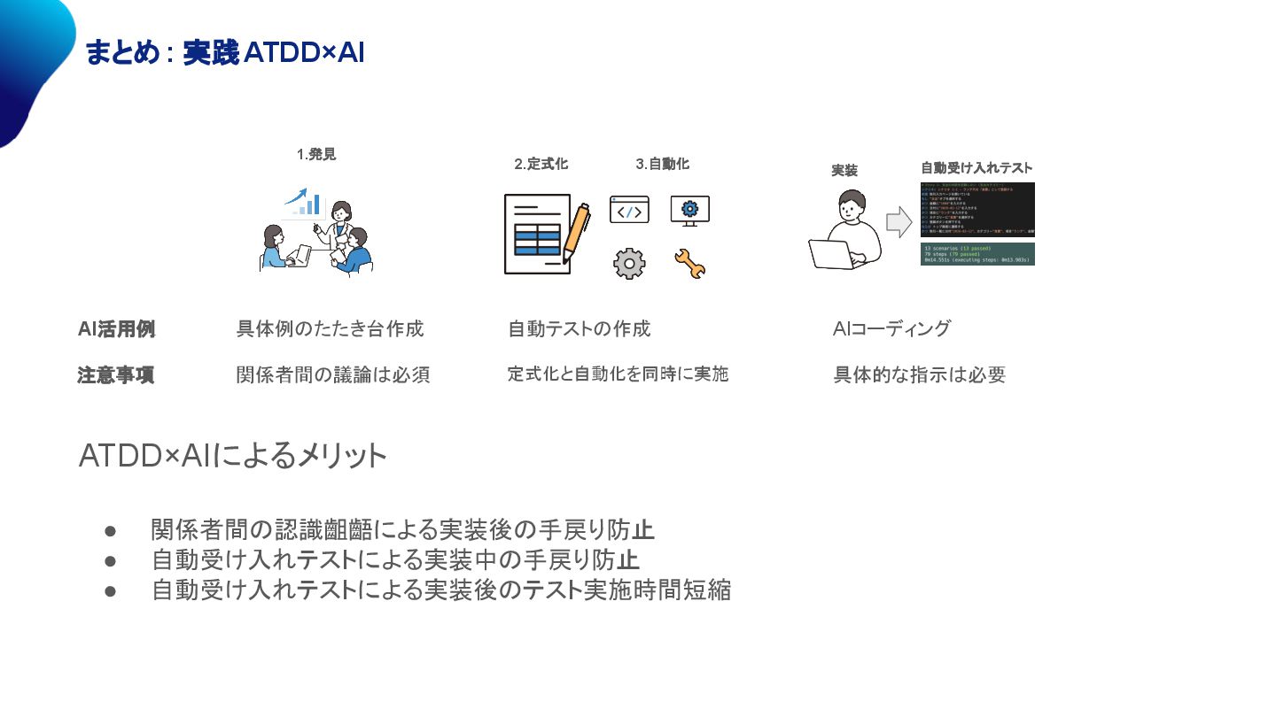 関係者間の議論は必須 自動テストの作成 定式化と自動化を同時に実施 AIコーディング 具体的な指示は必要 ATDD×AIによるメリット • 関係者間の認識齟齬による実装後の手戻り防止 • 自動受け入れテストによる実装中の手戻り防止 • 自動受け入れテストによる実装後のテスト実施時間短縮
