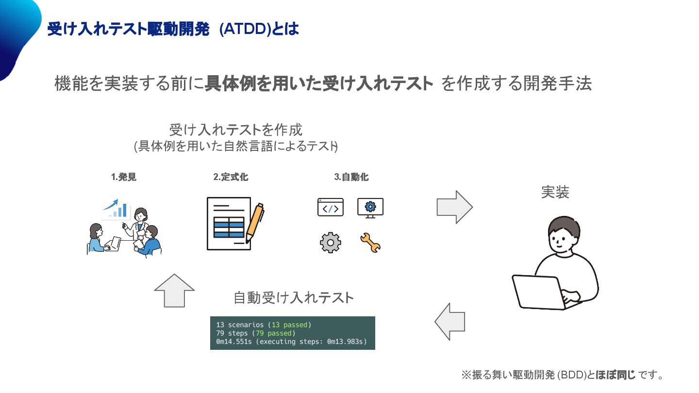 2.定式化 3.自動化 ※振る舞い駆動開発 (BDD)とほぼ同じ です。