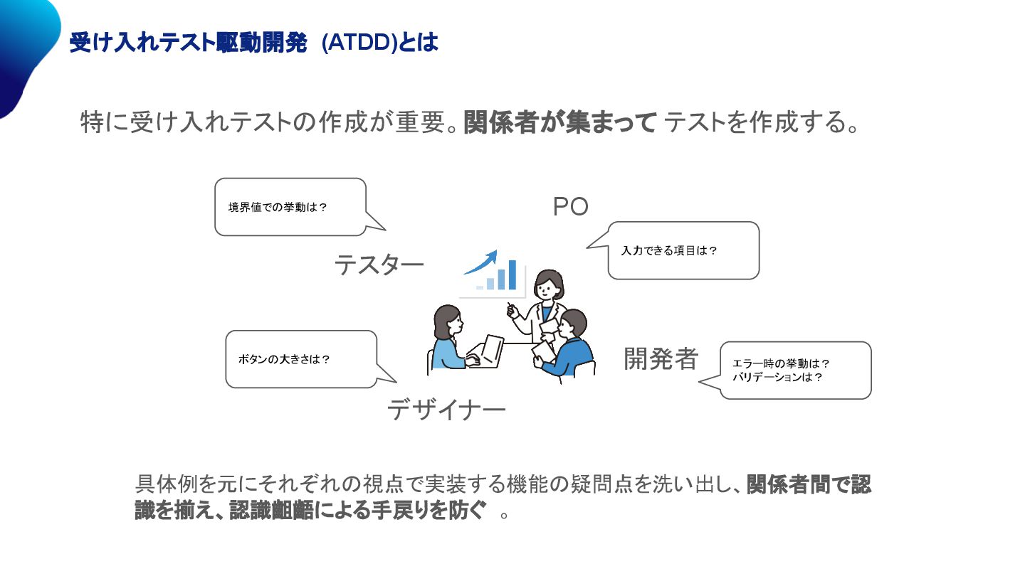 受け入れテスト駆動開発 (ATDD)とは 特に受け入れテストの作成が重要。関係者が集まって テストを作成する。 PO 開発者 デザイナー テスター 具体例を元にそれぞれの視点で実装する機能の疑問点を洗い出し、関係者間で認 識を揃え、認識齟齬による手戻りを防ぐ