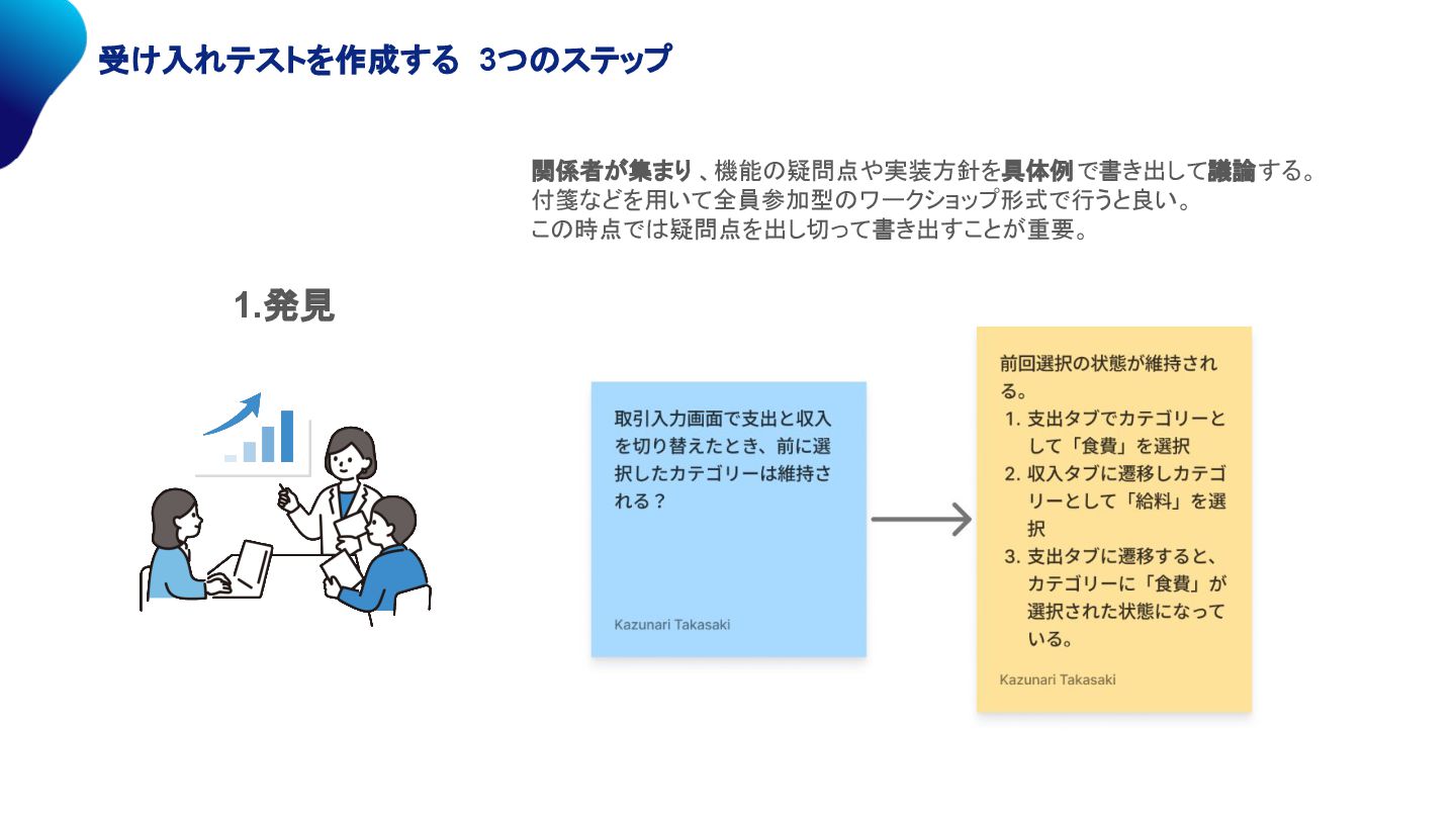 受け入れテストを作成する 3つのステップ 関係者が集まり 、機能の疑問点や実装方針を具体例で書き出して議論する。 付箋などを用いて全員参加型のワークショップ形式で行うと良い。 この時点では疑問点を出し切って書き出すことが重要。 1.発見