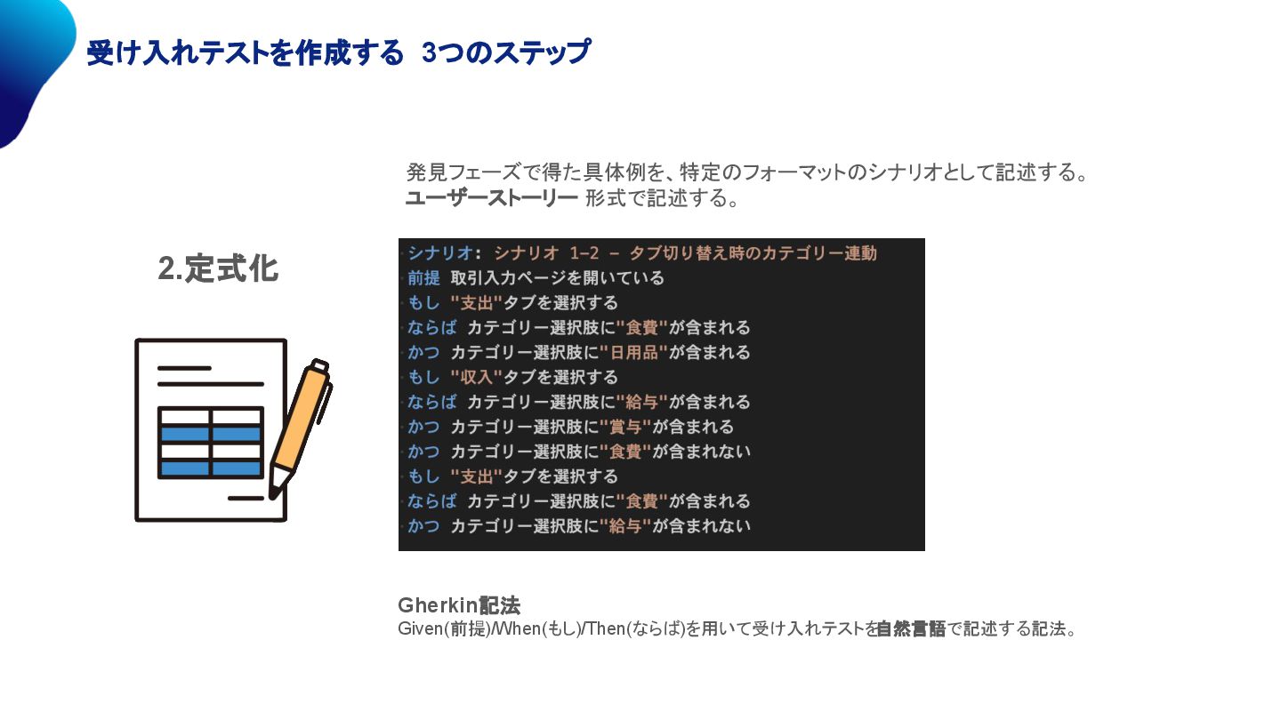 受け入れテストを作成する 3つのステップ 発見フェーズで得た具体例を、特定のフォーマットのシナリオとして記述する。 ユーザーストーリー 形式で記述する。 Gherkin記法 Given(前提)/When(もし)/Then(ならば)を用いて受け入れテストを 自然言語で記述する記法。 2.定式化
