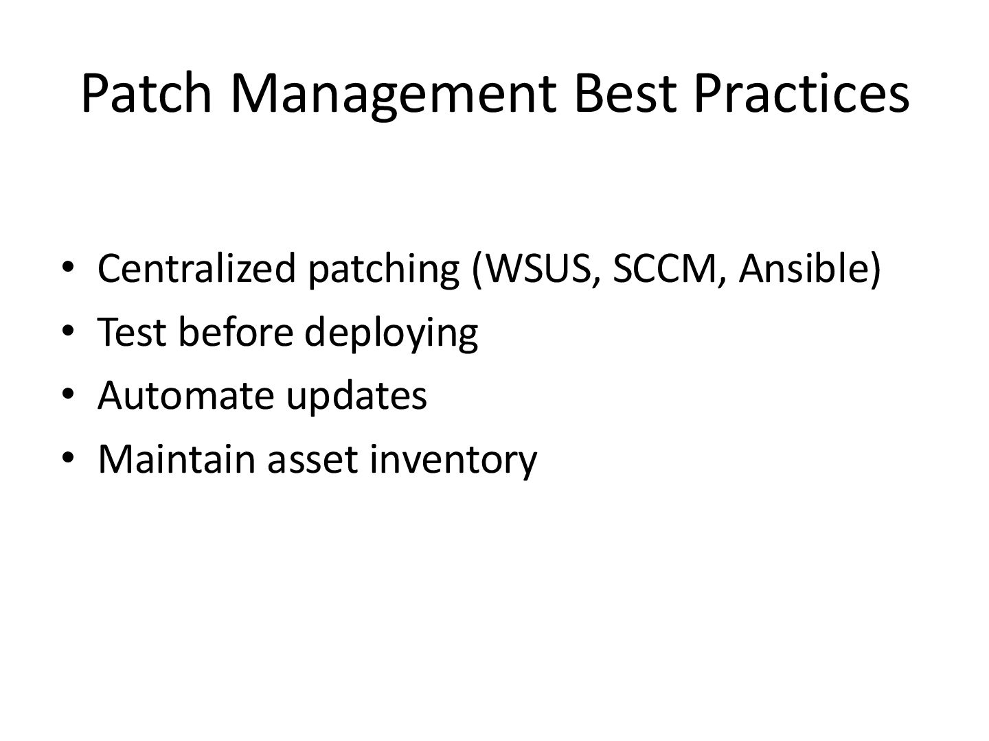 Patch Management Best Practices • Centralized patching (WSUS, SCCM, Ansible)