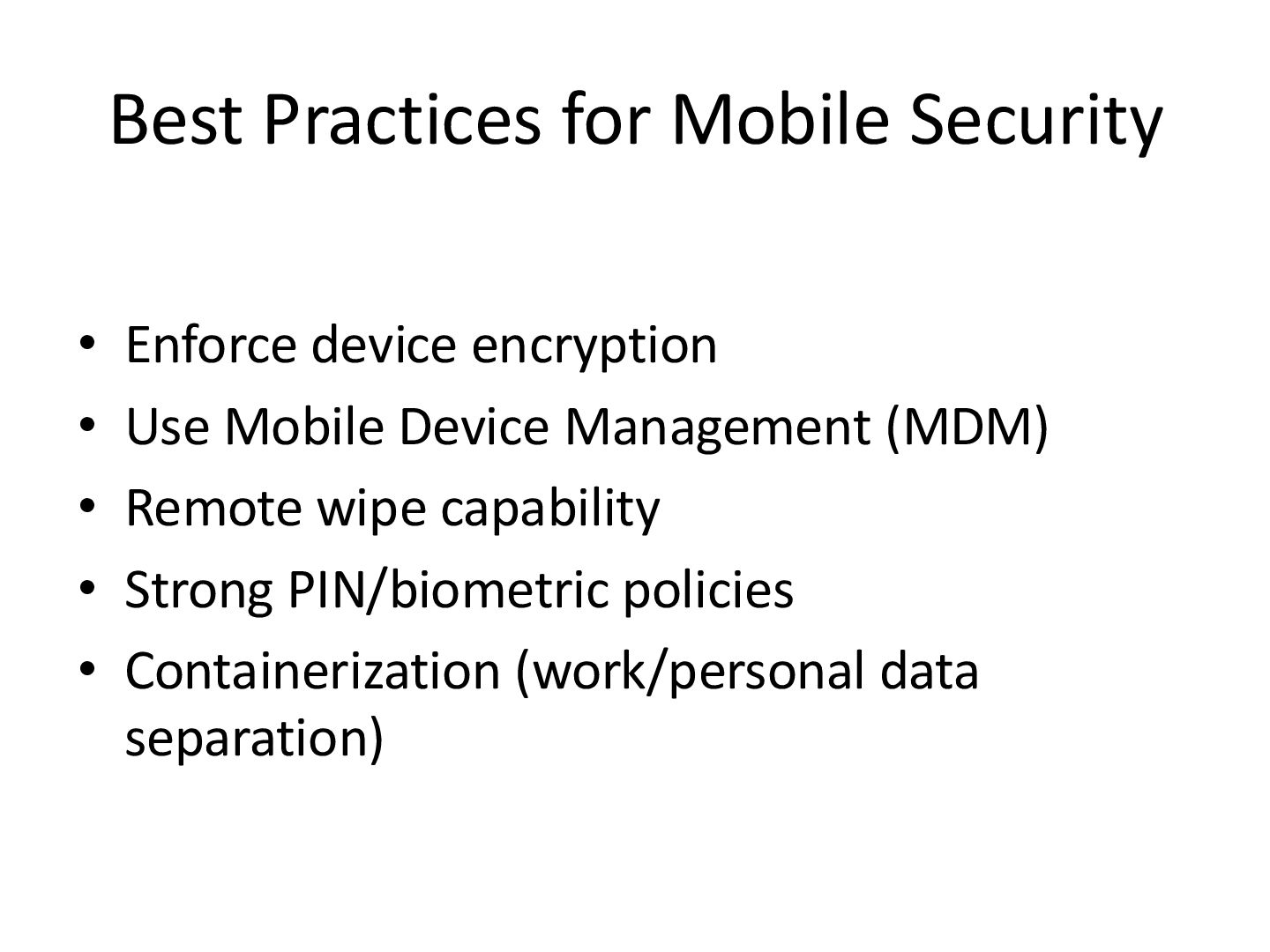 Use Mobile Device Management (MDM) • Remote wipe capability • Strong PIN/biometric policies • Containerization (work/personal data separation)