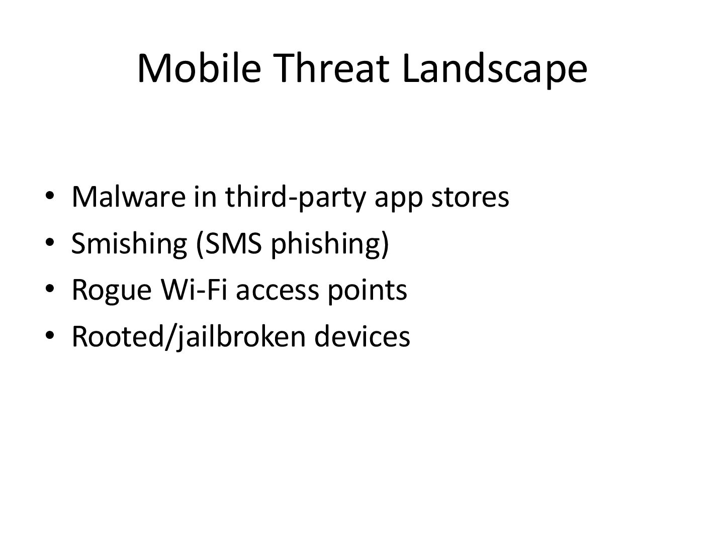 Smishing (SMS phishing) • Rogue Wi-Fi access points • Rooted/jailbroken devices