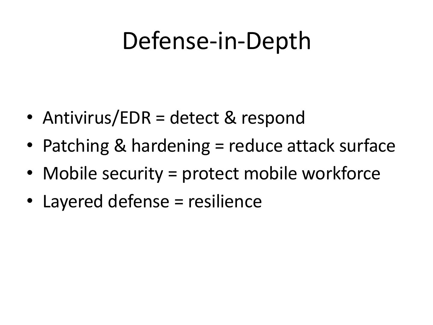 Defense-in-Depth • Antivirus/EDR = detect & respond • Patching &