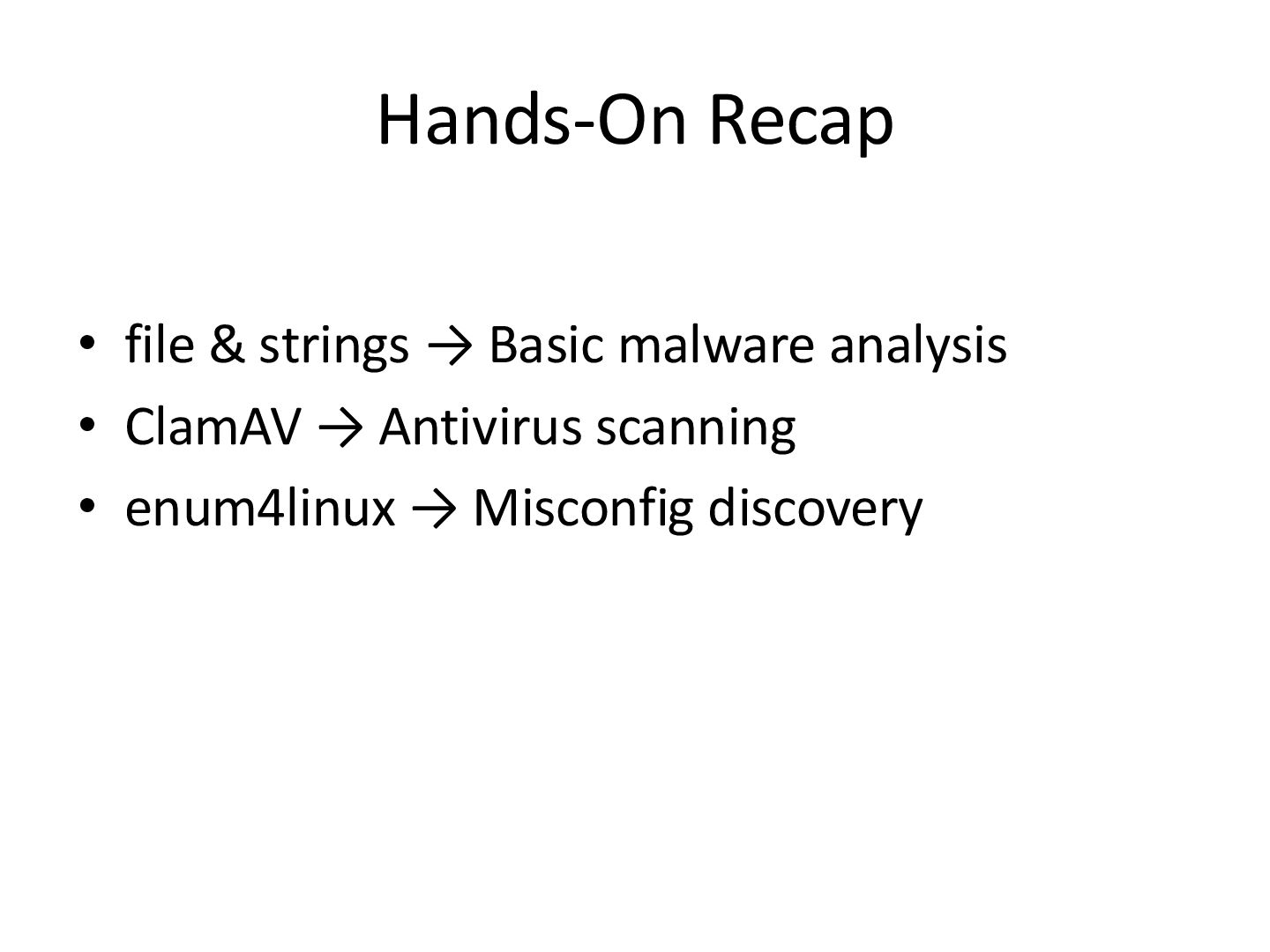• ClamAV → Antivirus scanning • enum4linux → Misconfig discovery