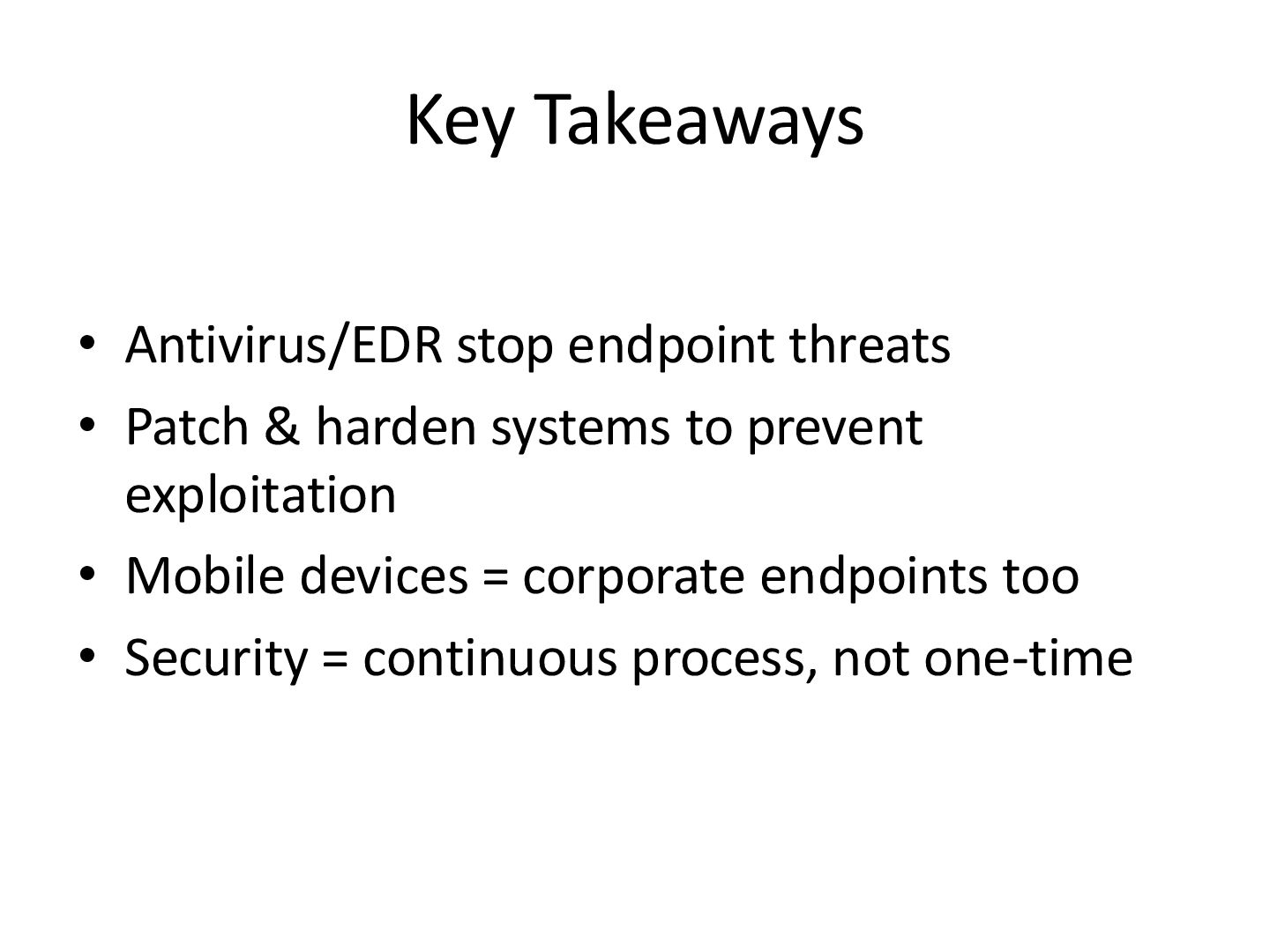 Key Takeaways • Antivirus/EDR stop endpoint threats • Patch &