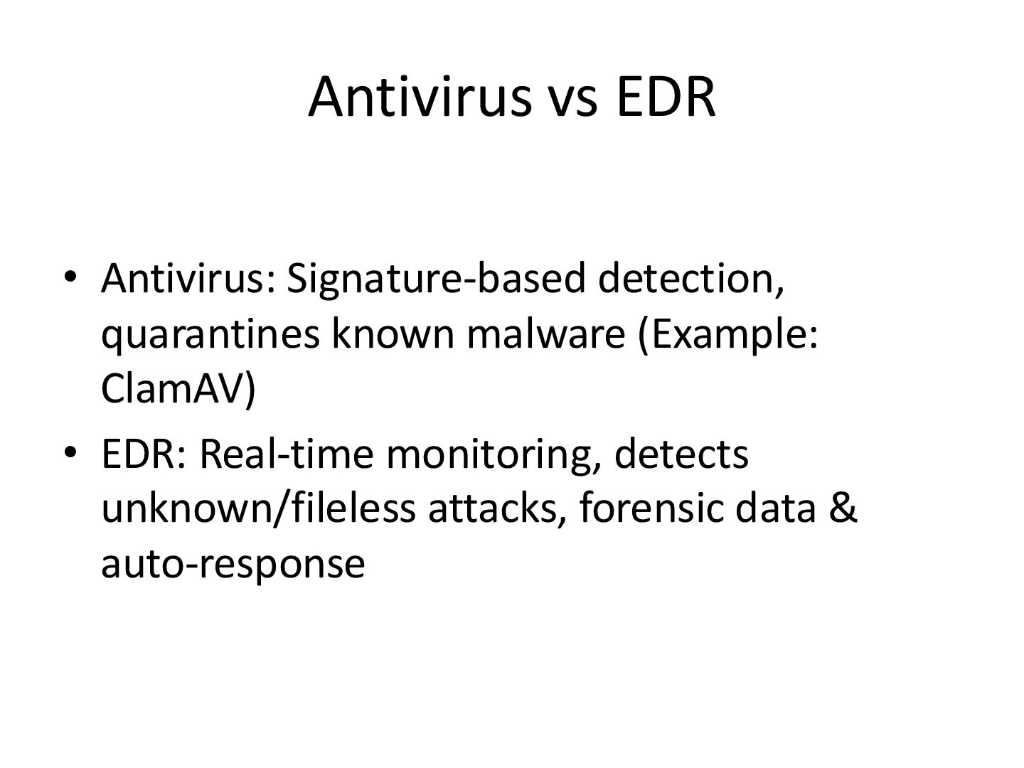 (Example: ClamAV) • EDR: Real-time monitoring, detects unknown/fileless attacks, forensic data & auto-response