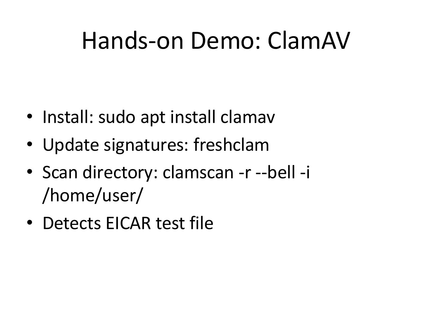 Hands-on Demo: ClamAV • Install: sudo apt install clamav •
