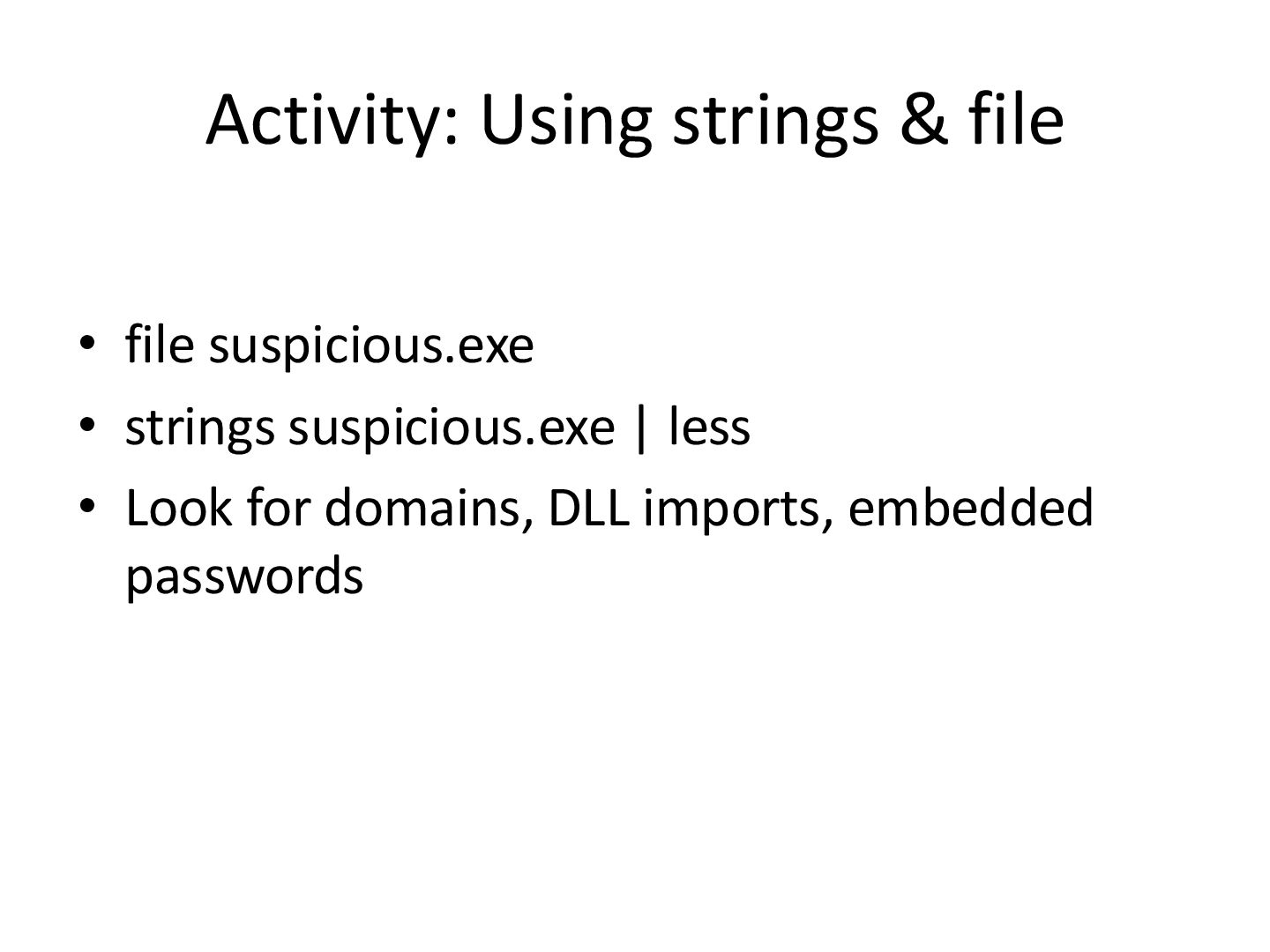 suspicious.exe | less • Look for domains, DLL imports, embedded passwords