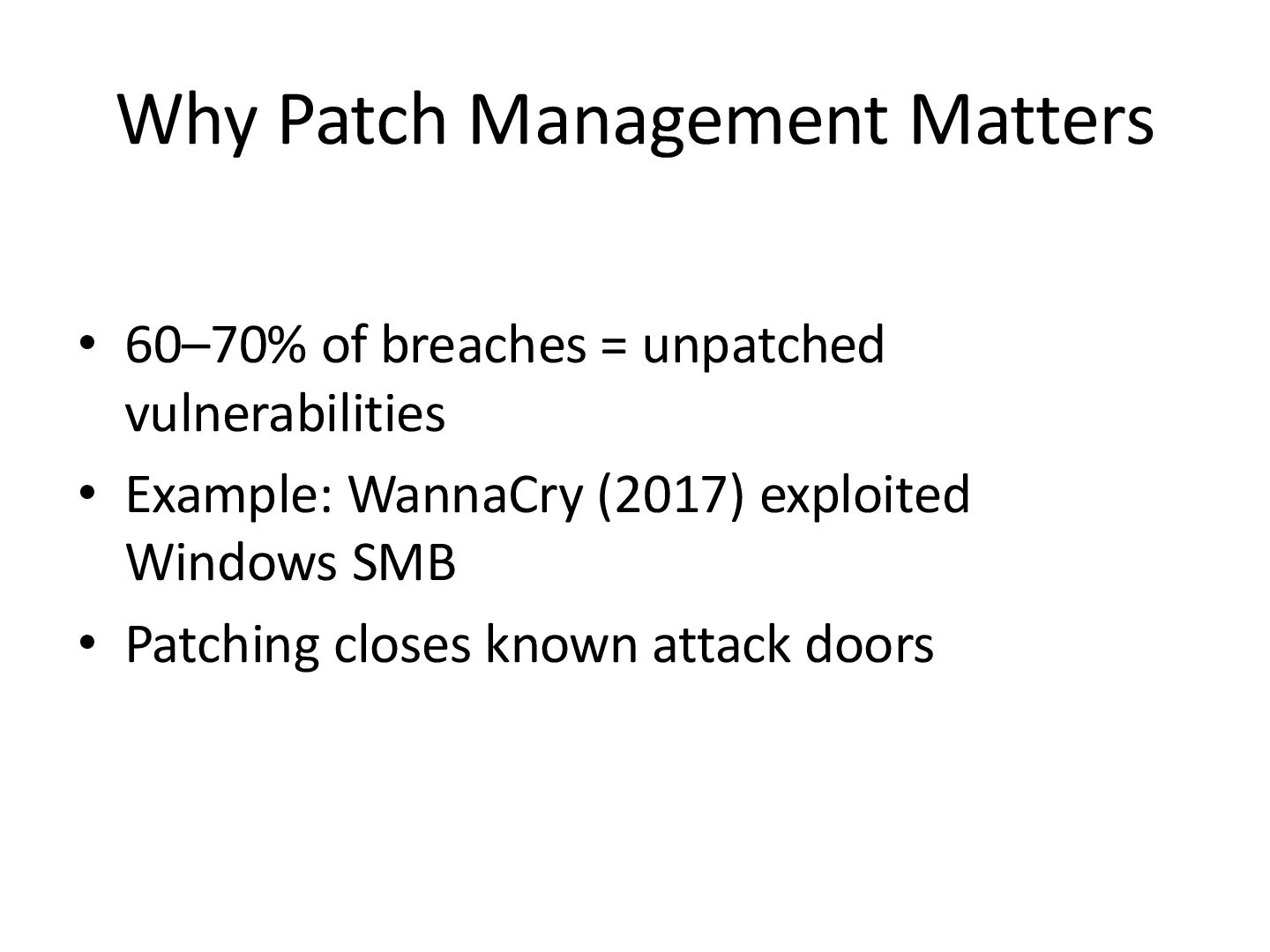 Why Patch Management Matters • 60–70% of breaches = unpatched