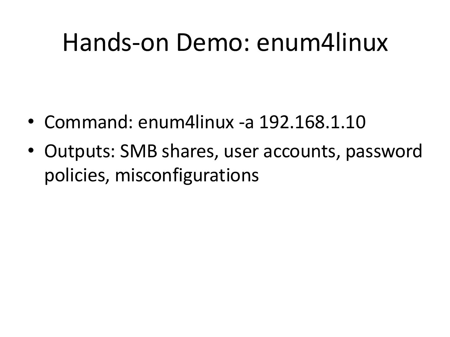 Hands-on Demo: enum4linux • Command: enum4linux -a 192.168.1.10 • Outputs: