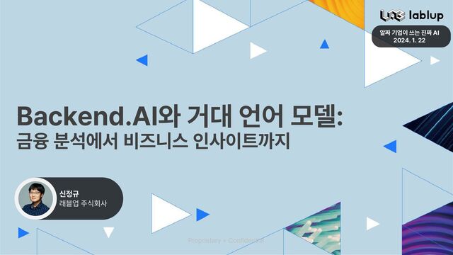 Backend.AI Enterprise • 거대 언어 모델 및 생성 AI 모델 운영 및 사용 – GenAI Desktop • AI 모델 파인 튜닝 – Backend.AI FastTrack • 에어갭 환경의 불편함 해결 – Backend.AI Reservoir 래블업 금융 플랫폼 구조 소개 FastTrack MLOps GenAI Desktop AI Training On-prem Cloud Business Insight