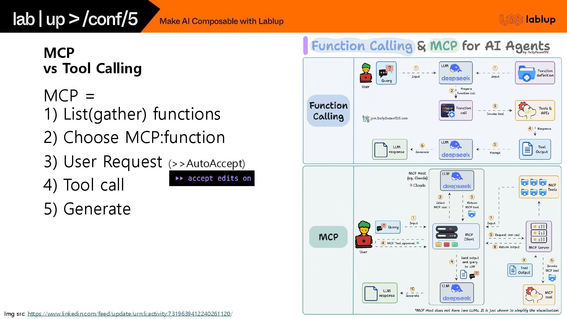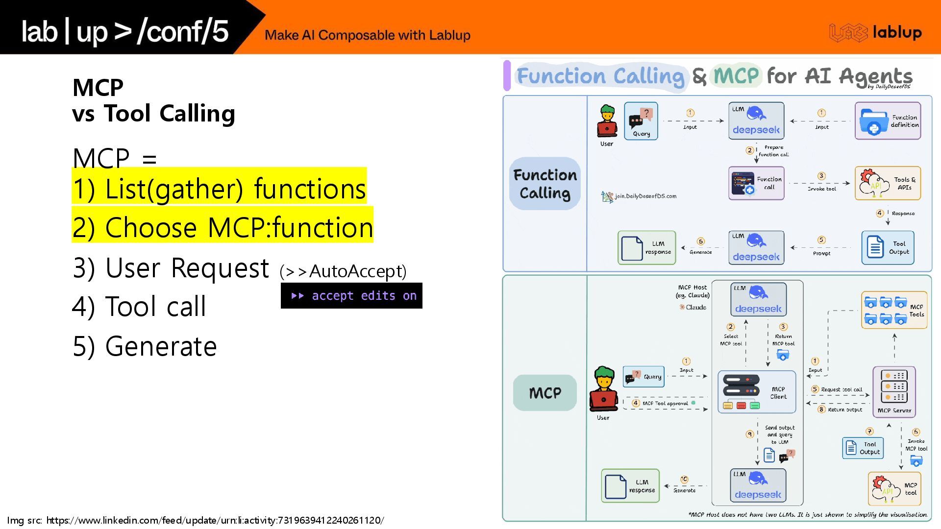 Choose MCP:function 3) User Request (>>AutoAccept) 4) Tool call 5) Generate Img src: https://www.linkedin.com/feed/update/urn:li:activity:7319639412240261120/