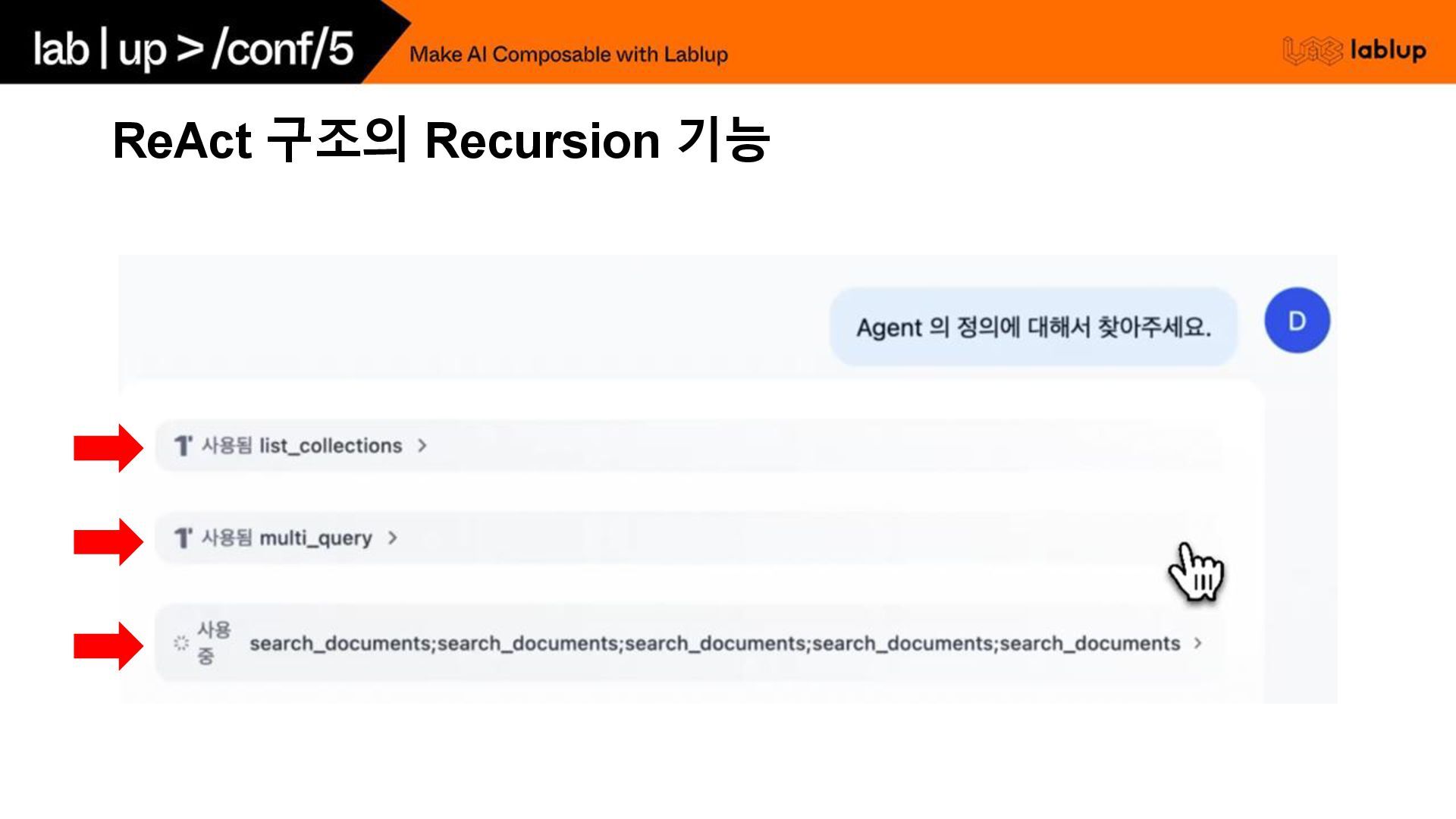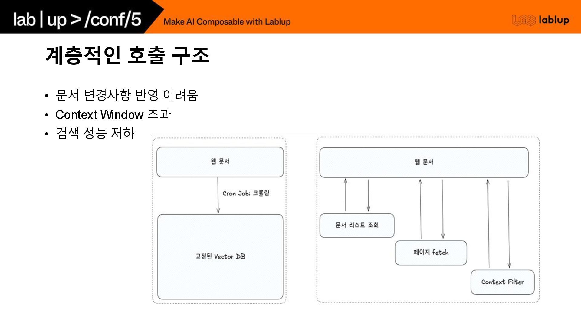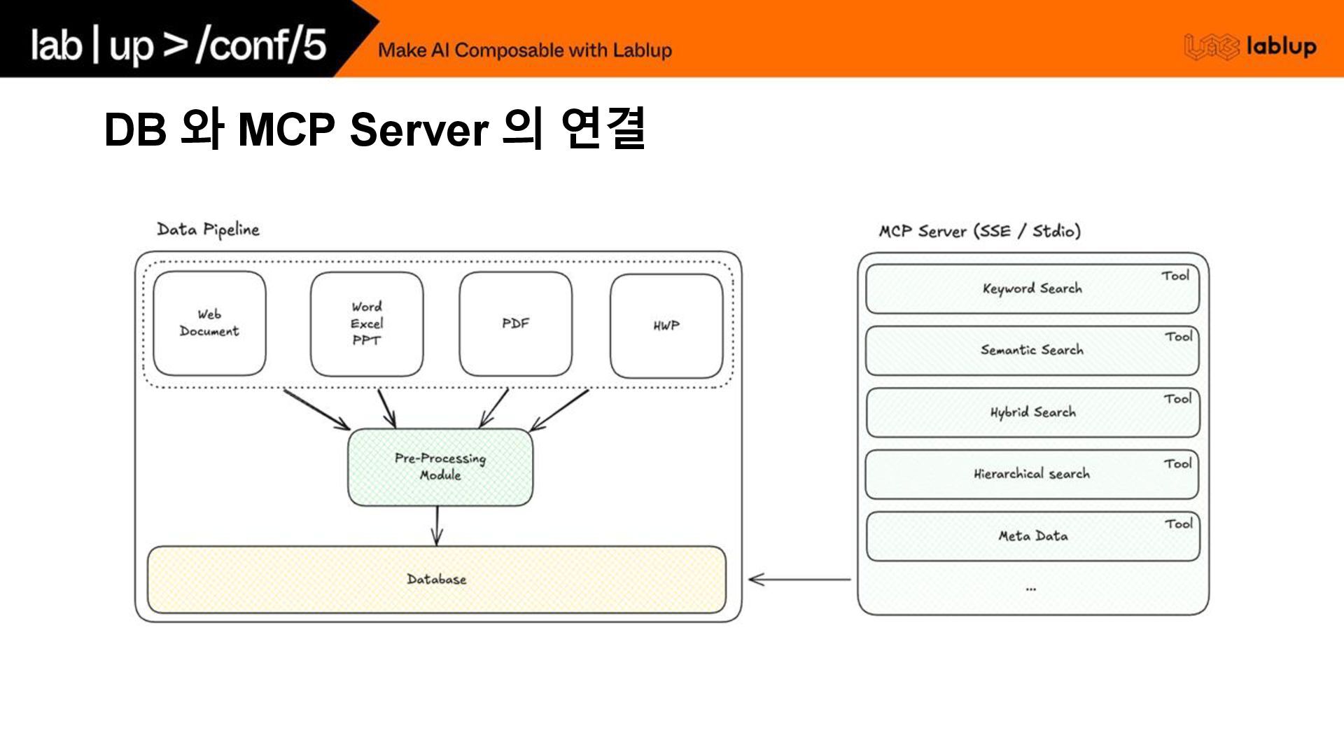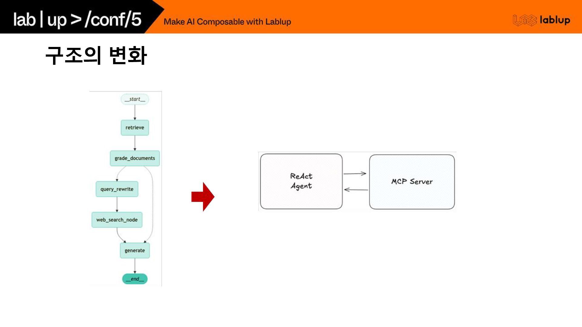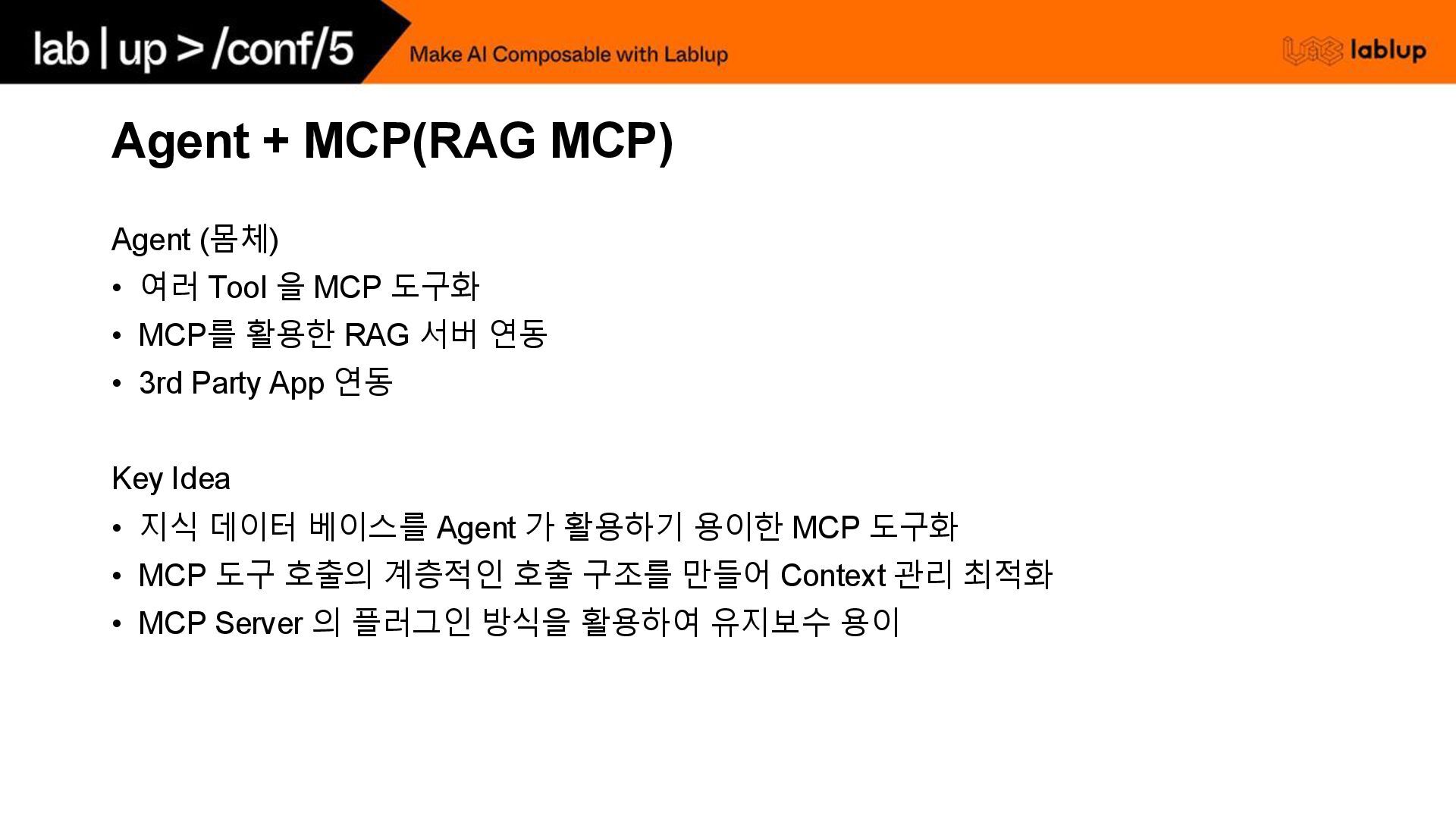 MCP 도구화 • MCP를 활용한 RAG 서버 연동 • 3rd Party App 연동 Key Idea • 지식 데이터 베이스를 Agent 가 활용하기 용이한 MCP 도구화 • MCP 도구 호출의 계층적인 호출 구조를 만들어 Context 관리 최적화 • MCP Server 의 플러그인 방식을 활용하여 유지보수 용이