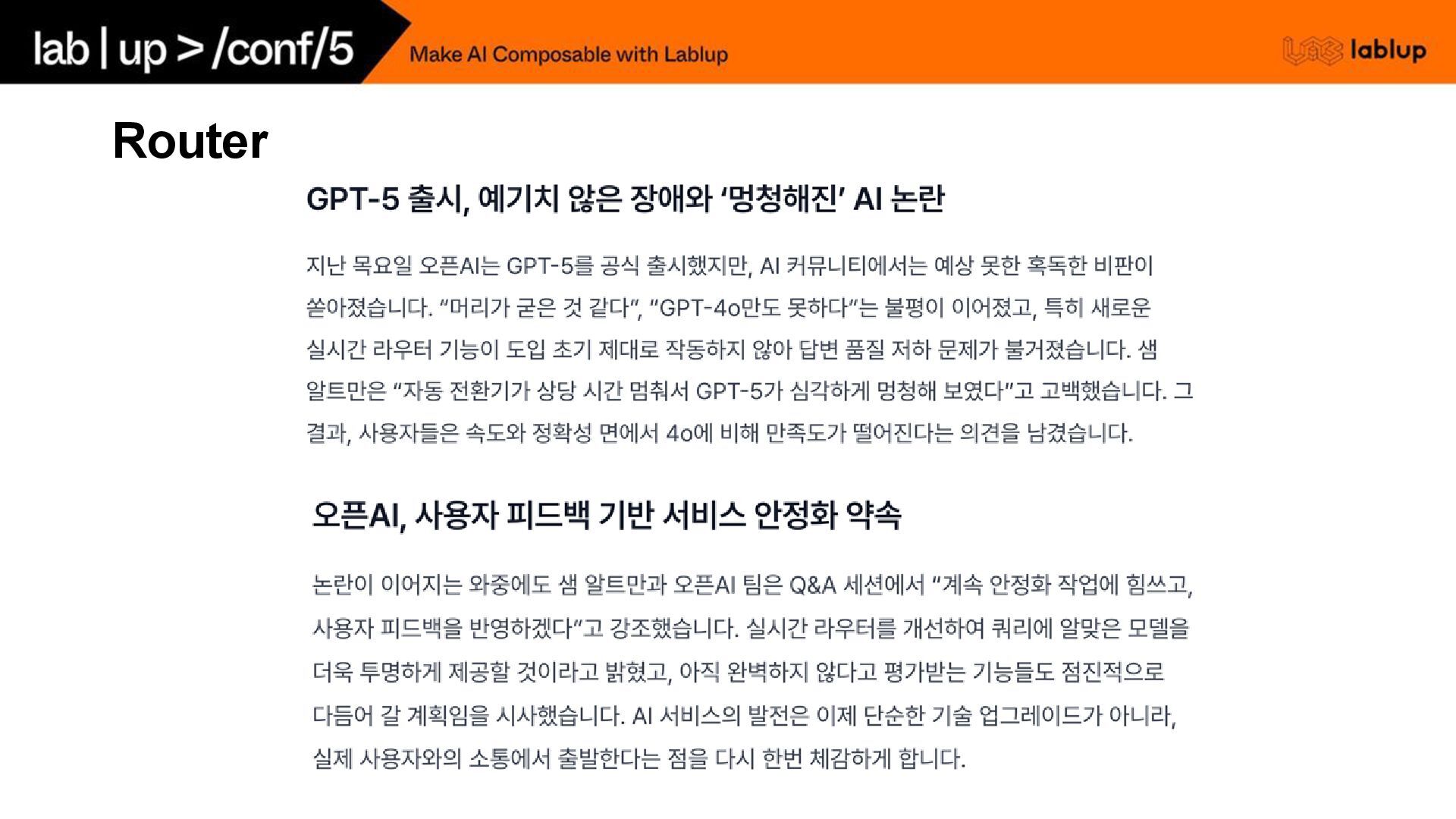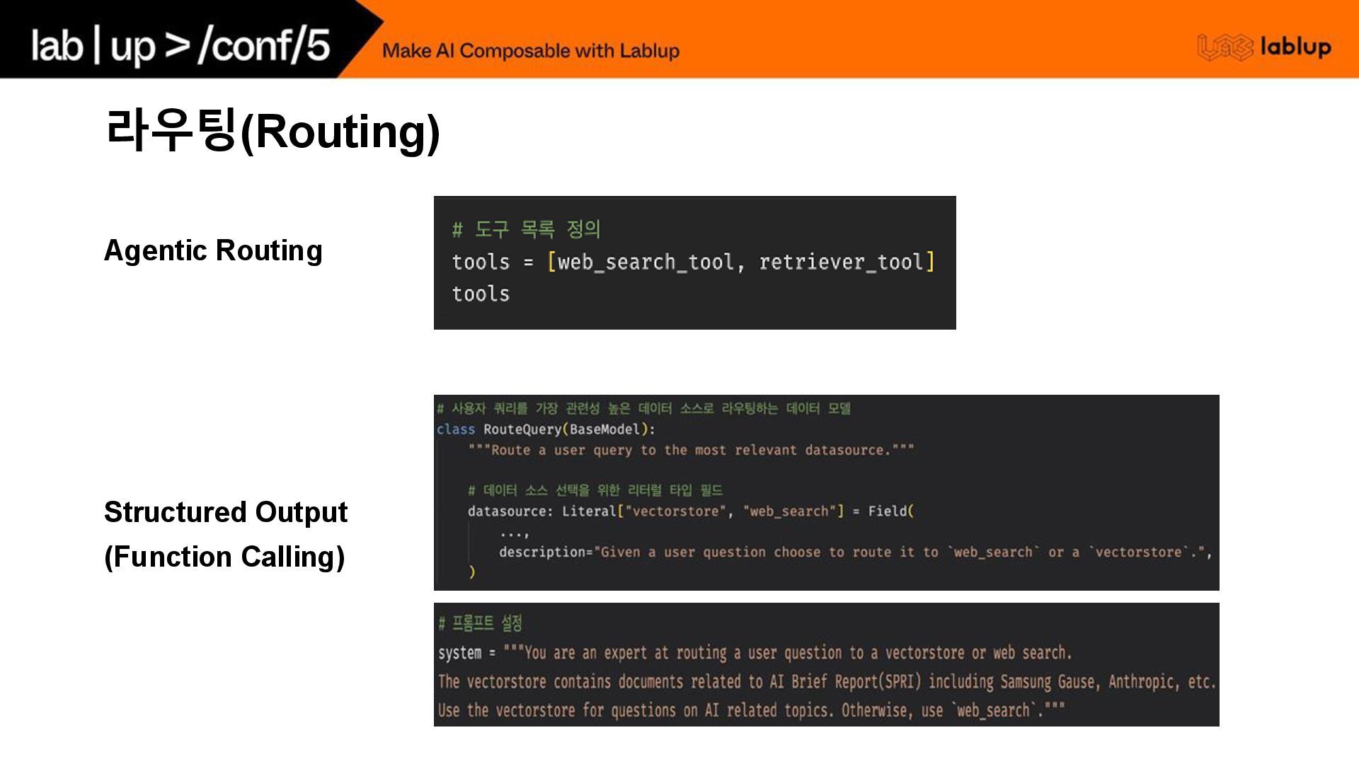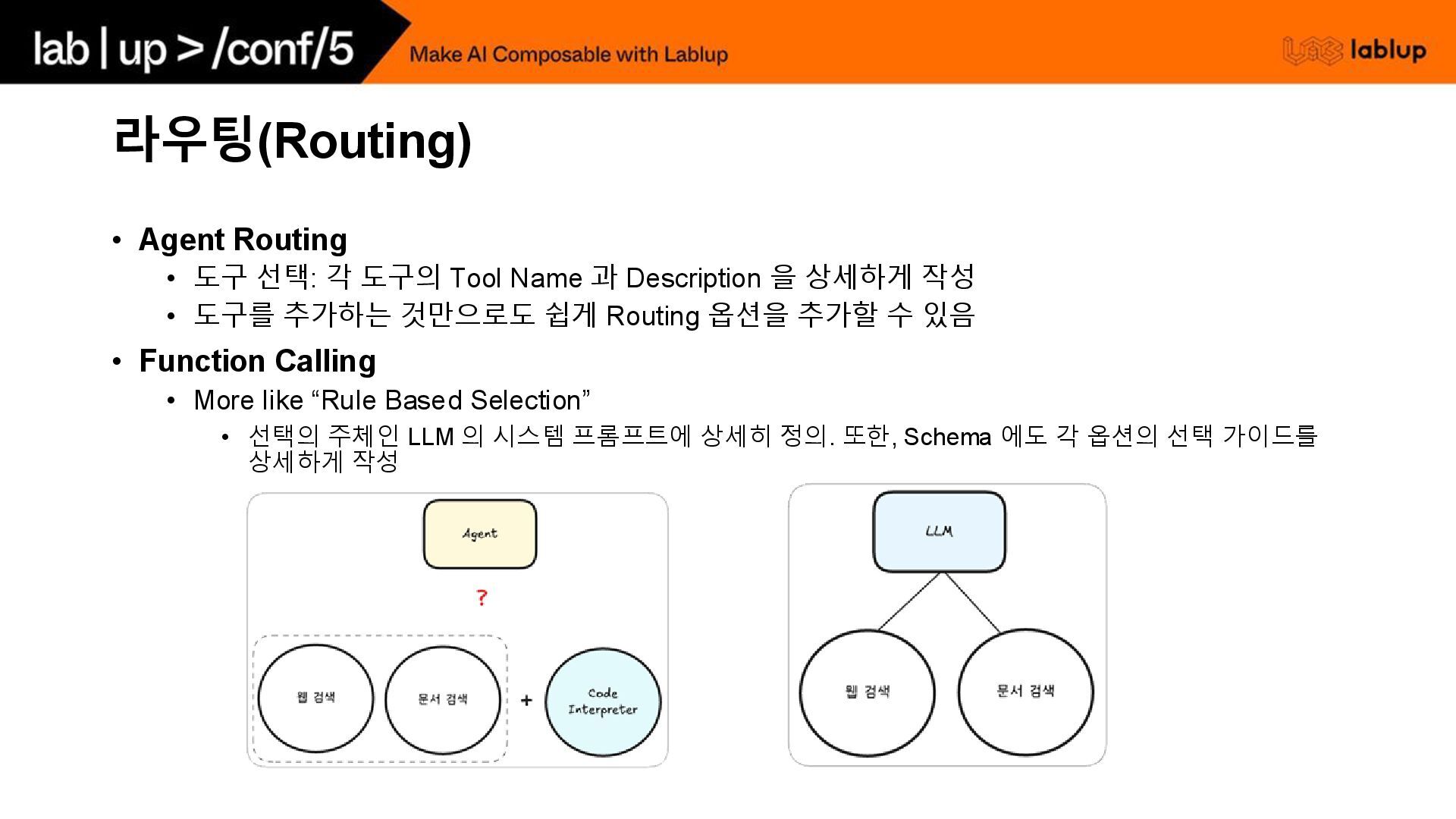 Name 과 Description 을 상세하게 작성 • 도구를 추가하는 것만으로도 쉽게 Routing 옵션을 추가할 수 있음 • Function Calling • More like “Rule Based Selection” • 선택의 주체인 LLM 의 시스템 프롬프트에 상세히 정의. 또한, Schema 에도 각 옵션의 선택 가이드를 상세하게 작성