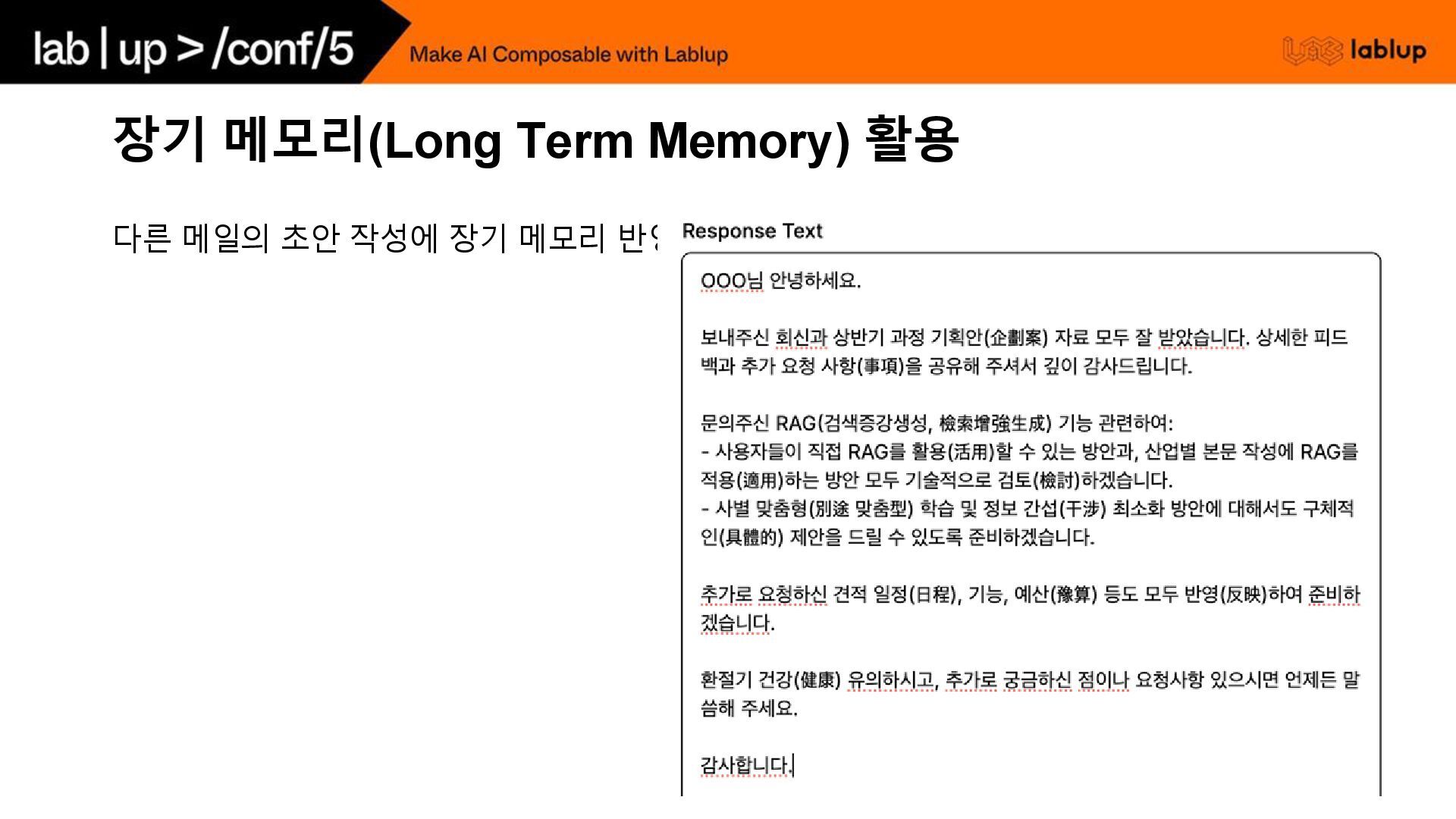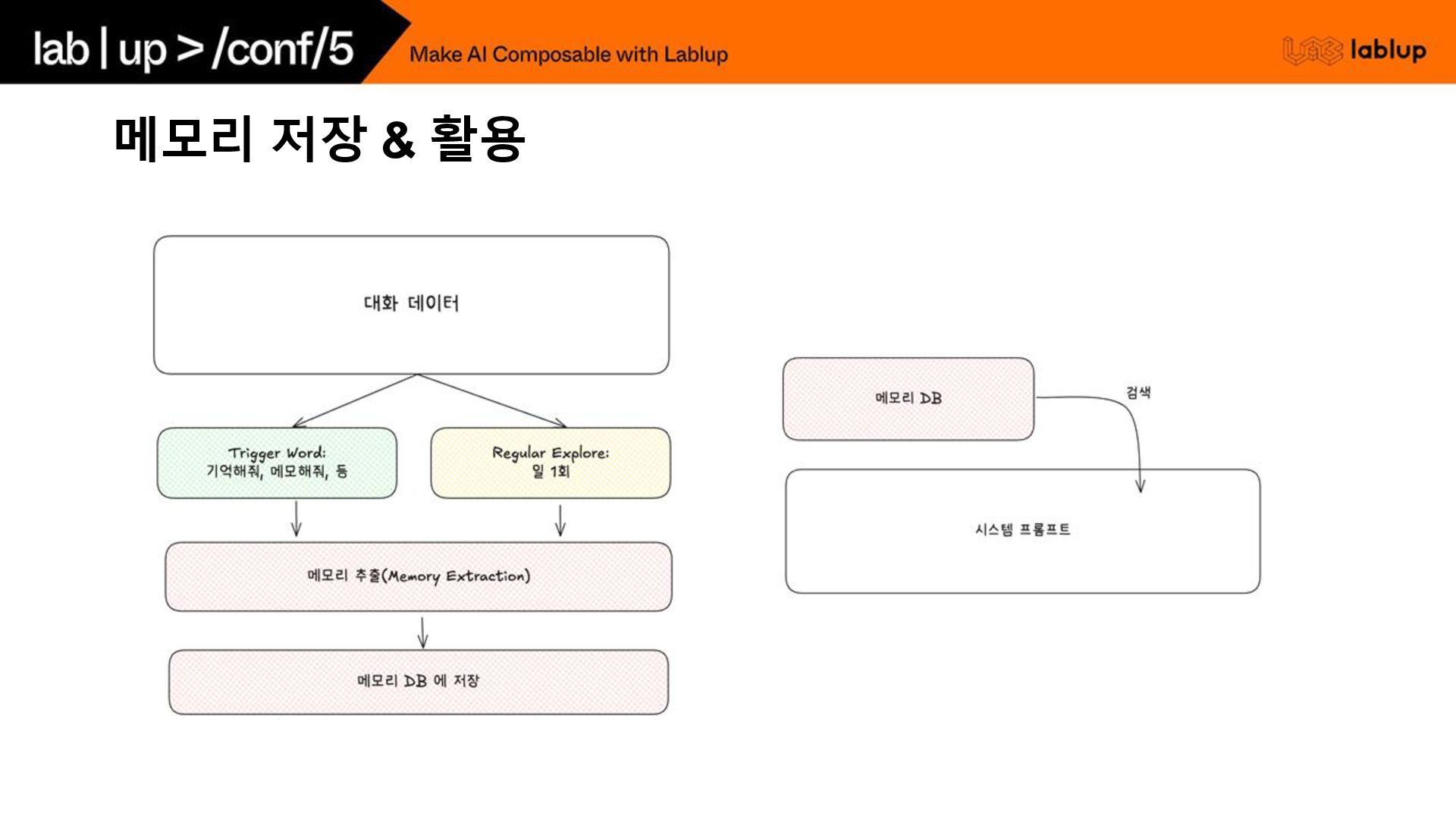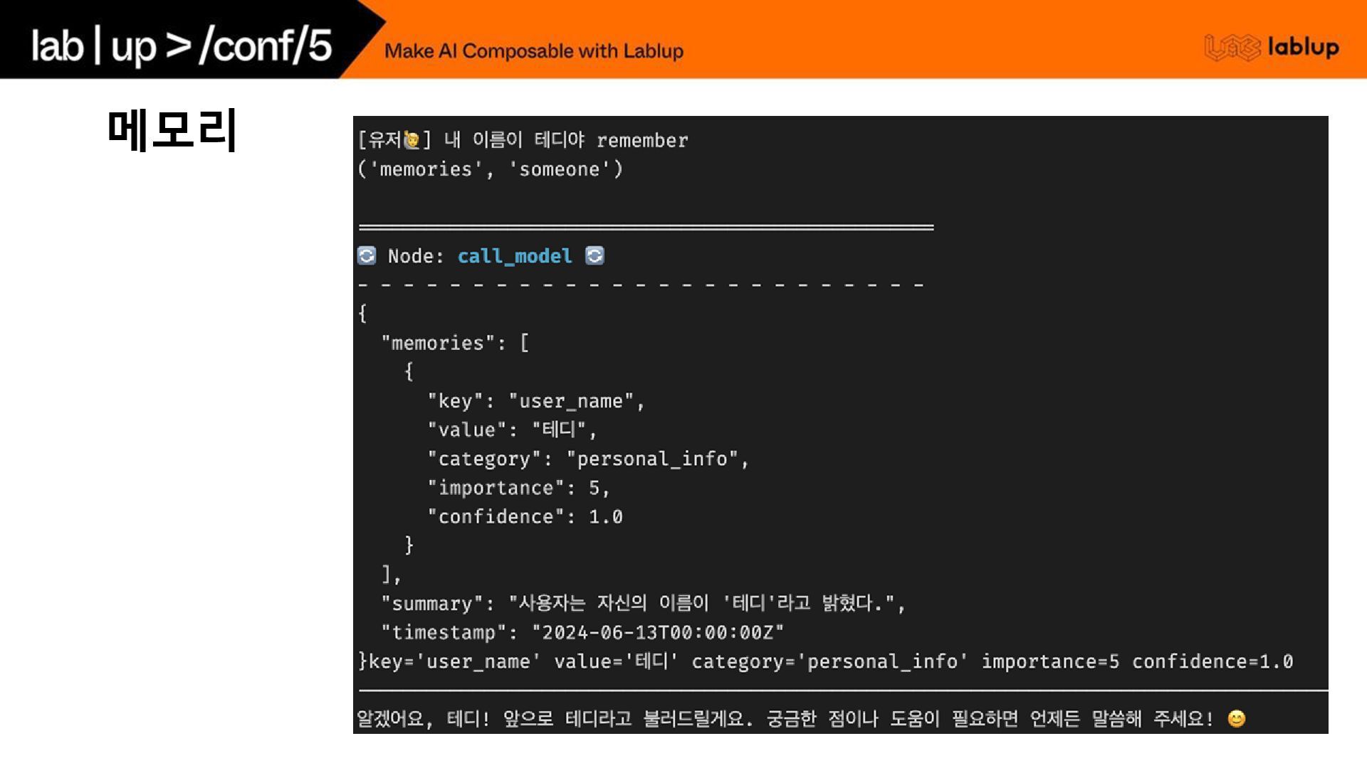 을 추출하여 장기 메모리에 저장 • 이름, 직업, 취향, 선호하는 음식, 취미 등 변하지 않는 User 의 고유 정보를 대화에서 추출하여 장기메모리에 저장 • 여러 thread 에서 User 별 특성을 장기 기억할 수 있음