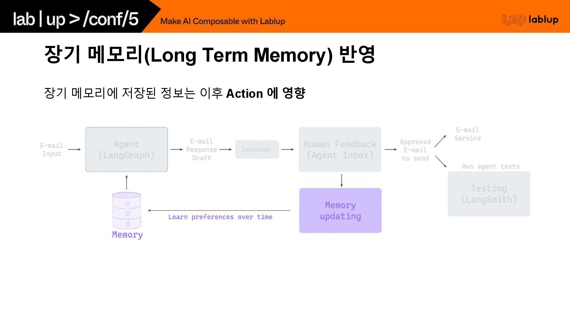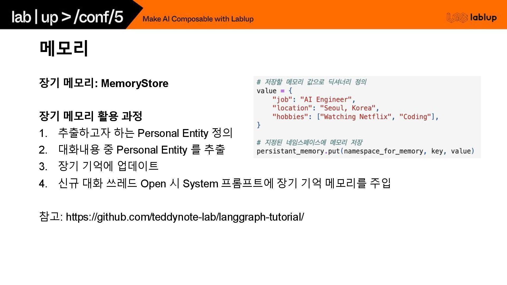 하는 Personal Entity 정의 2. 대화내용 중 Personal Entity 를 추출 3. 장기 기억에 업데이트 4. 신규 대화 쓰레드 Open 시 System 프롬프트에 장기 기억 메모리를 주입 참고: https://github.com/teddynote-lab/langgraph-tutorial/