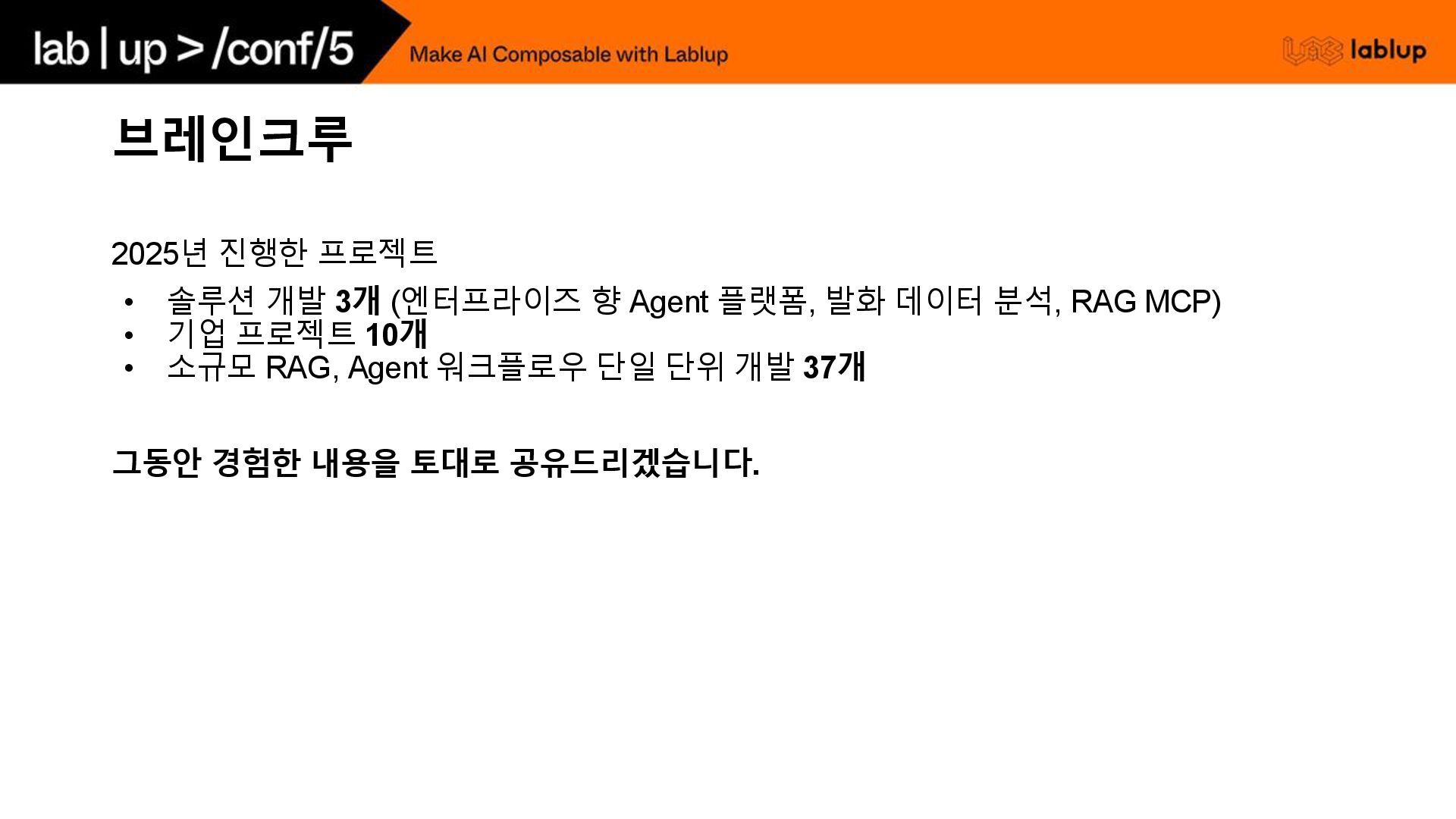 Agent 플랫폼, 발화 데이터 분석, RAG MCP) • 기업 프로젝트 10개 • 소규모 RAG, Agent 워크플로우 단일 단위 개발 37개 그동안 경험한 내용을 토대로 공유드리겠습니다.