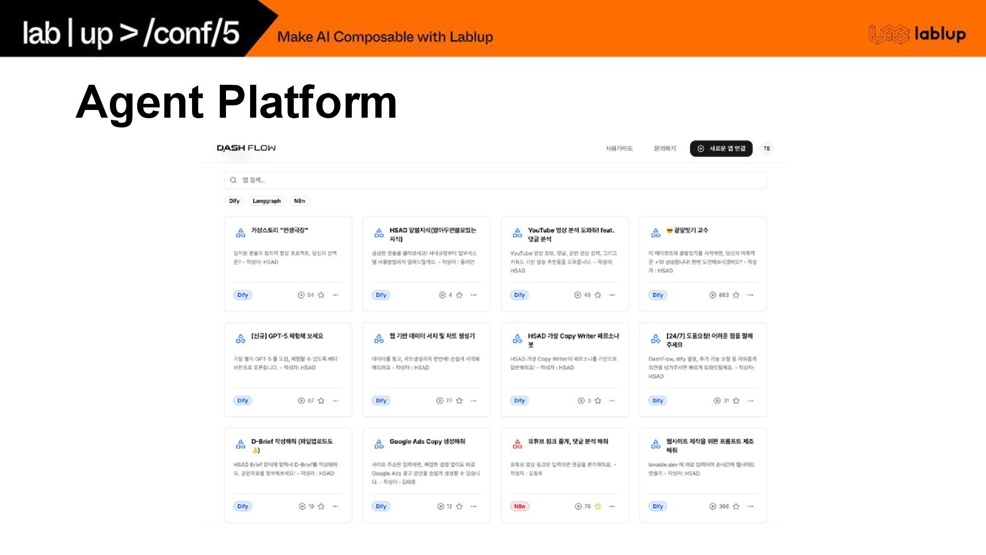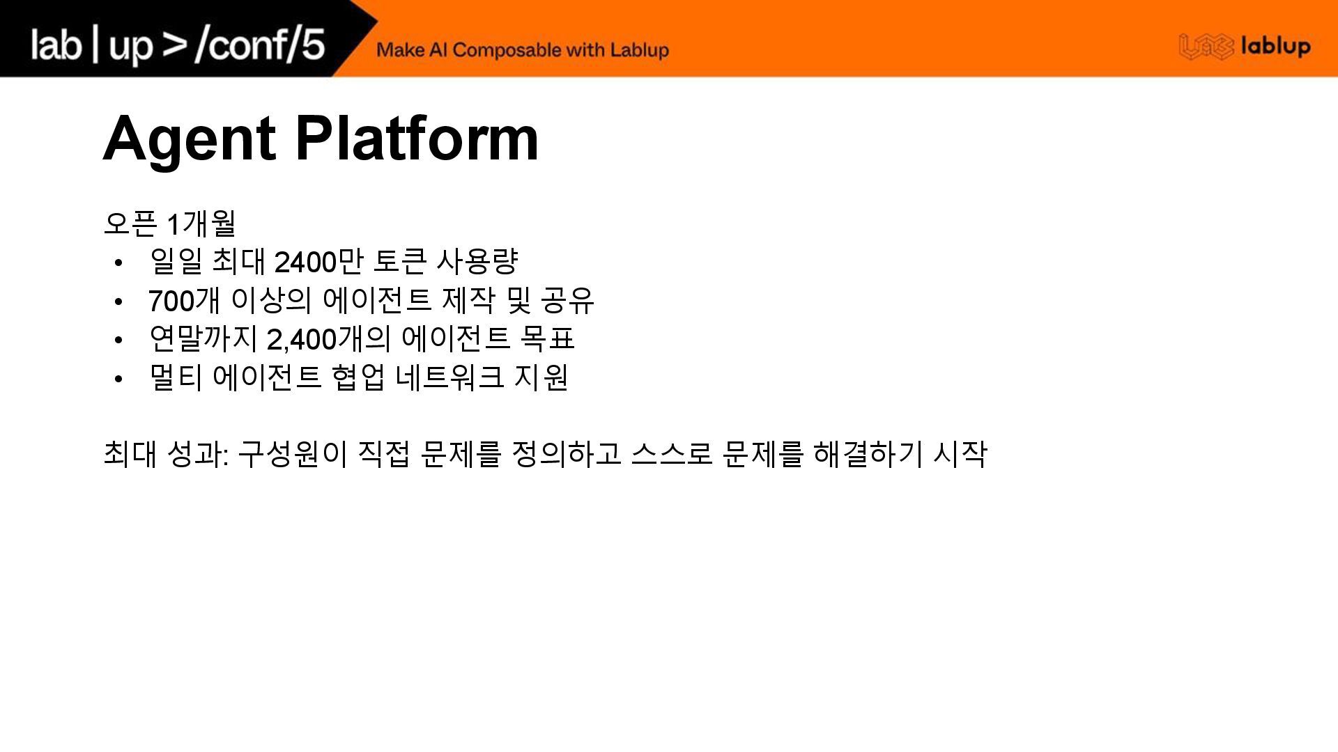 • 700개 이상의 에이전트 제작 및 공유 • 연말까지 2,400개의 에이전트 목표 • 멀티 에이전트 협업 네트워크 지원 최대 성과: 구성원이 직접 문제를 정의하고 스스로 문제를 해결하기 시작