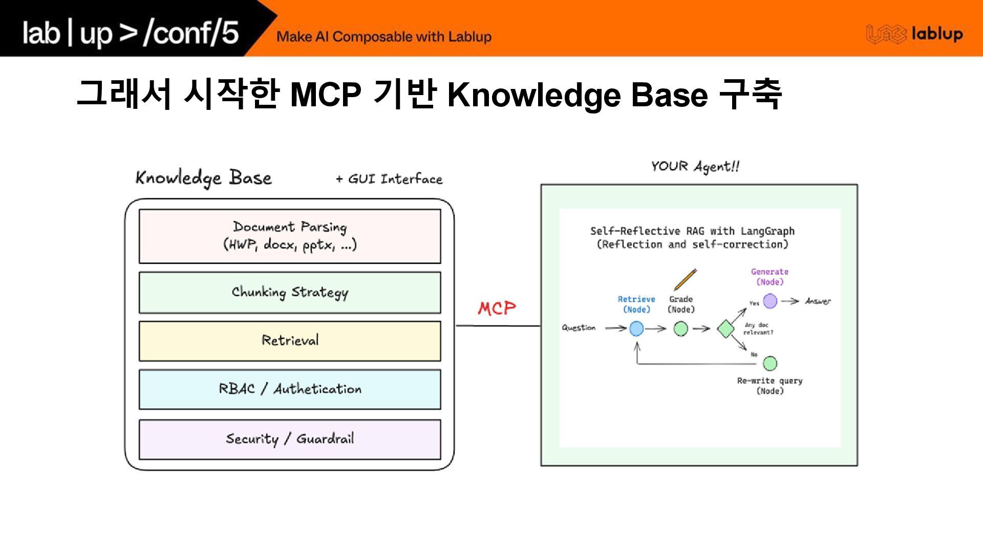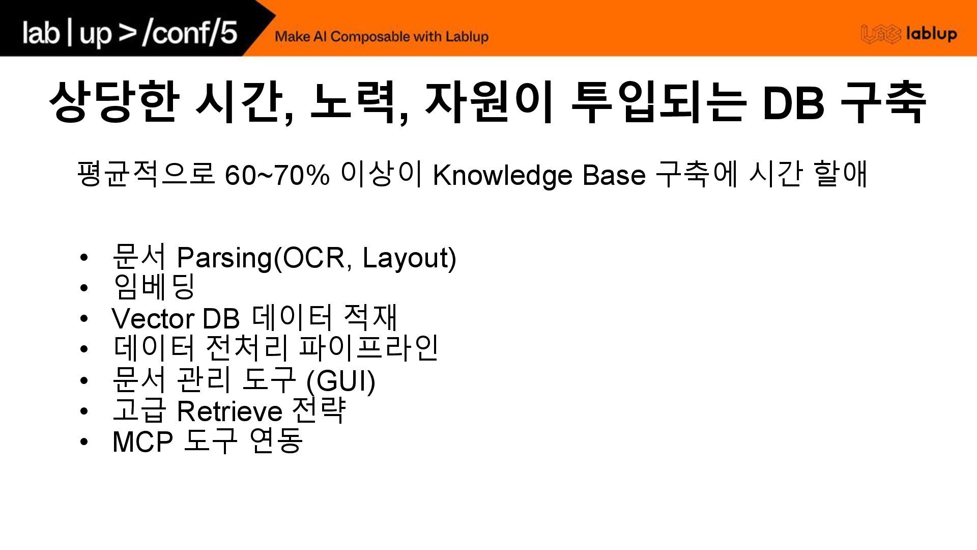 Knowledge Base 구축에 시간 할애 • 문서 Parsing(OCR, Layout) • 임베딩 • Vector DB 데이터 적재 • 데이터 전처리 파이프라인 • 문서 관리 도구 (GUI) • 고급 Retrieve 전략 • MCP 도구 연동