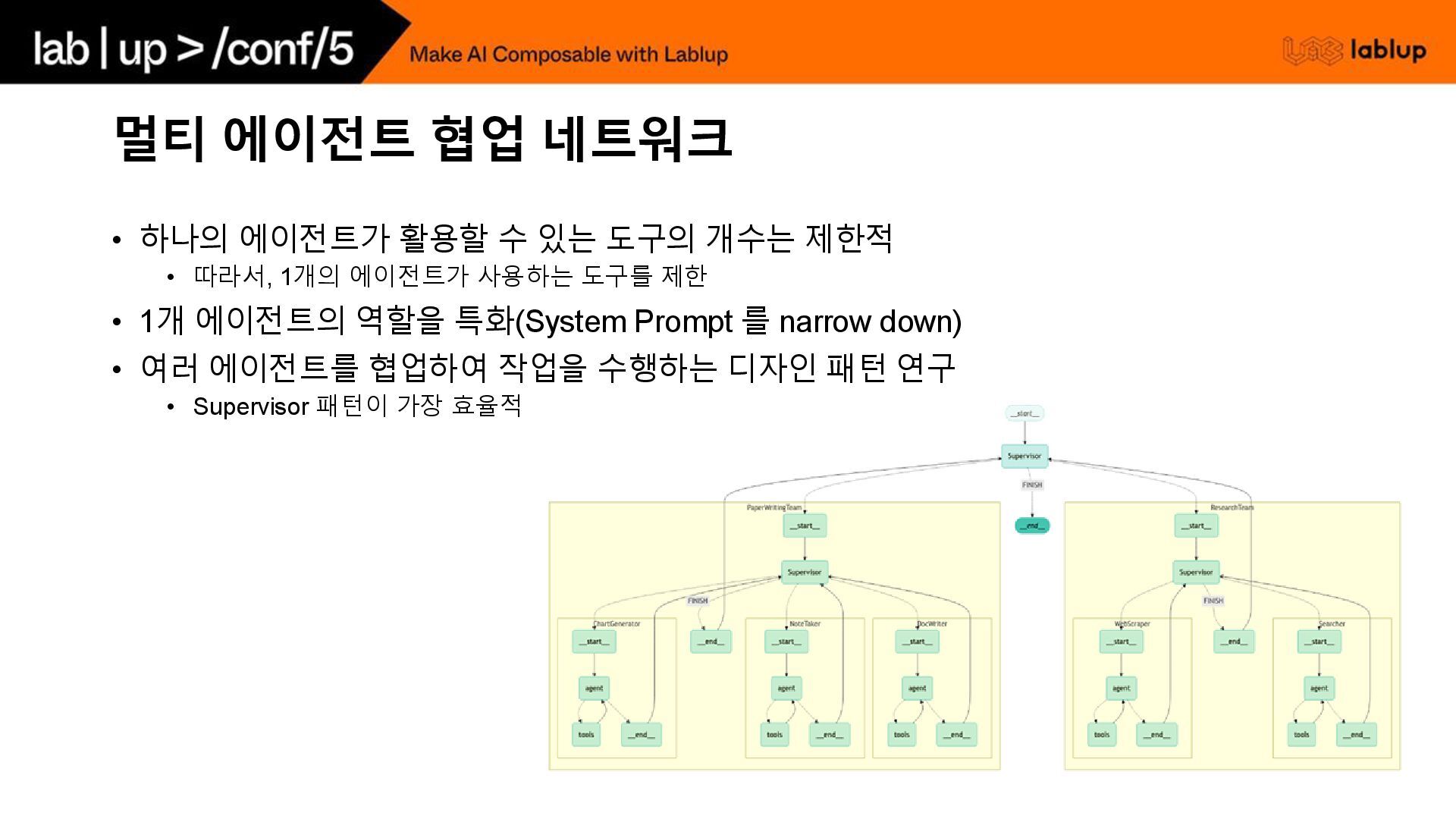 도구의 개수는 제한적 • 따라서, 1개의 에이전트가 사용하는 도구를 제한 • 1개 에이전트의 역할을 특화(System Prompt 를 narrow down) • 여러 에이전트를 협업하여 작업을 수행하는 디자인 패턴 연구 • Supervisor 패턴이 가장 효율적