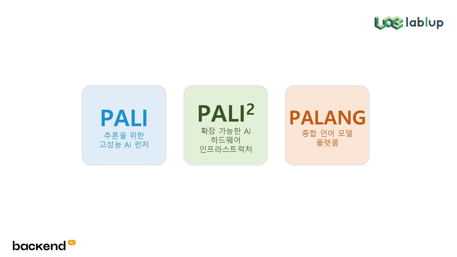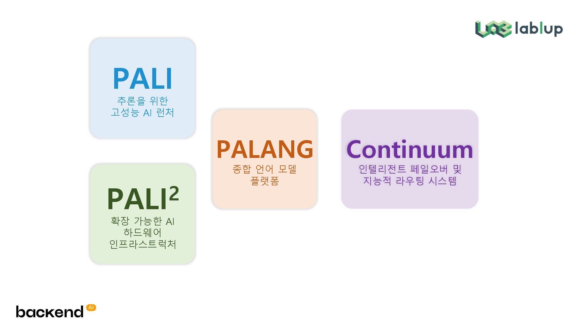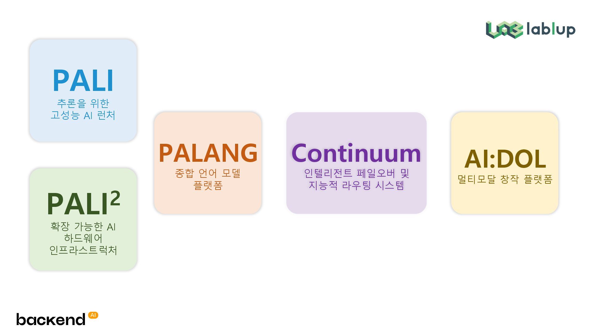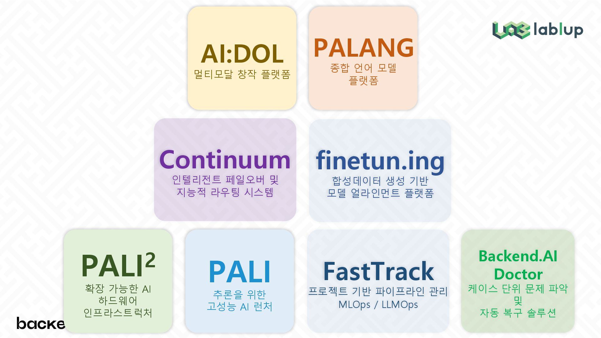 하드웨어 인프라스트럭처 PALANG 종합 언어 모델 플랫폼 Continuum 인텔리전트 페일오버 및 지능적 라우팅 시스템 AI:DOL 멀티모달 창작 플랫폼 FastTrack 프로젝트 기반 파이프라인 관리 MLOps / LLMOps finetun.ing 합성데이터 생성 기반 모델 얼라인먼트 플랫폼 Backend.AI Doctor 케이스 단위 문제 파악 및 자동 복구 솔루션