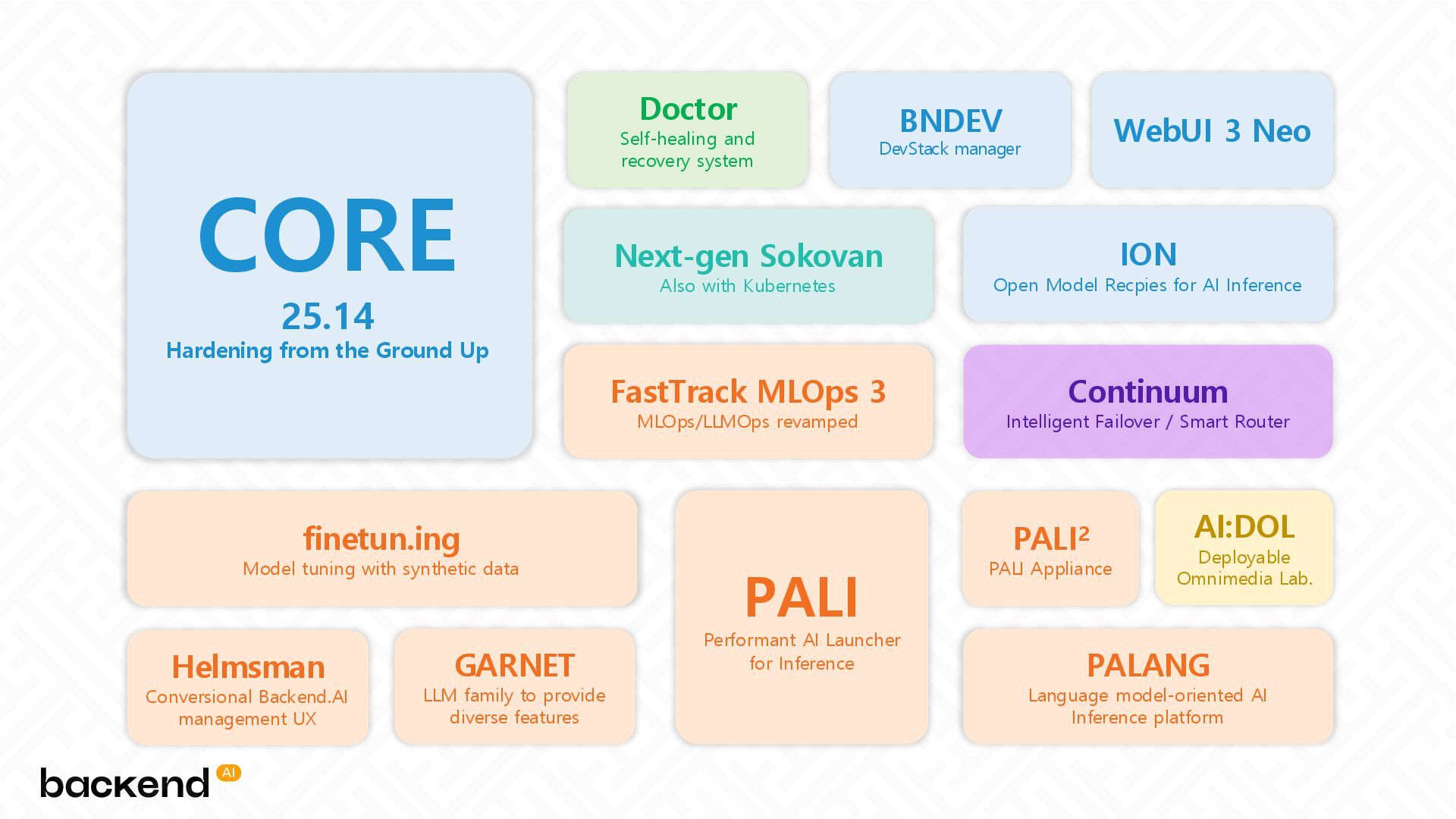 Recpies for AI Inference BNDEV DevStack manager FastTrack MLOps 3 MLOps/LLMOps revamped Doctor Self-healing and recovery system Continuum Intelligent Failover / Smart Router Helmsman Conversional Backend.AI management UX PALI Performant AI Launcher for Inference PALI2 PALI Appliance PALANG Language model-oriented AI Inference platform GARNET LLM family to provide diverse features Next-gen Sokovan Also with Kubernetes finetun.ing Model tuning with synthetic data WebUI 3 Neo AI:DOL Deployable Omnimedia Lab.