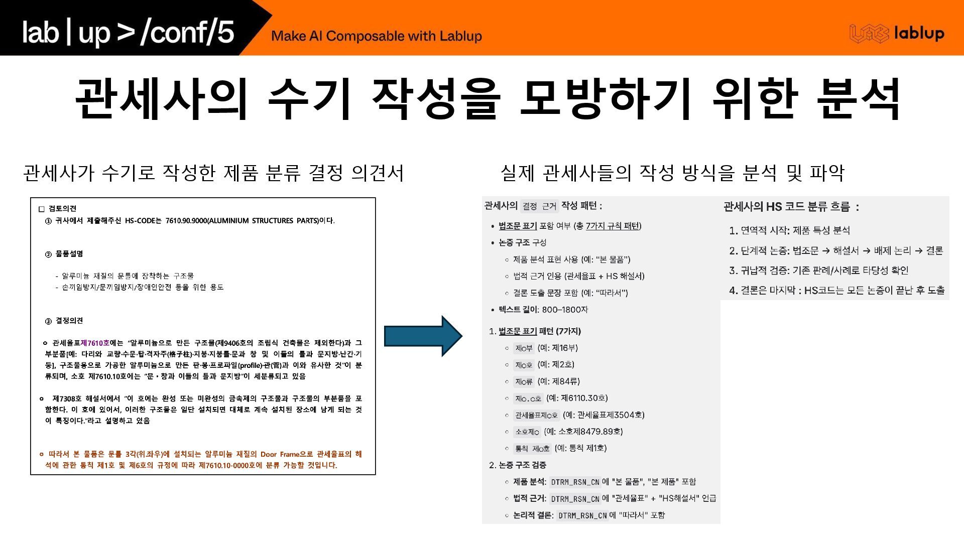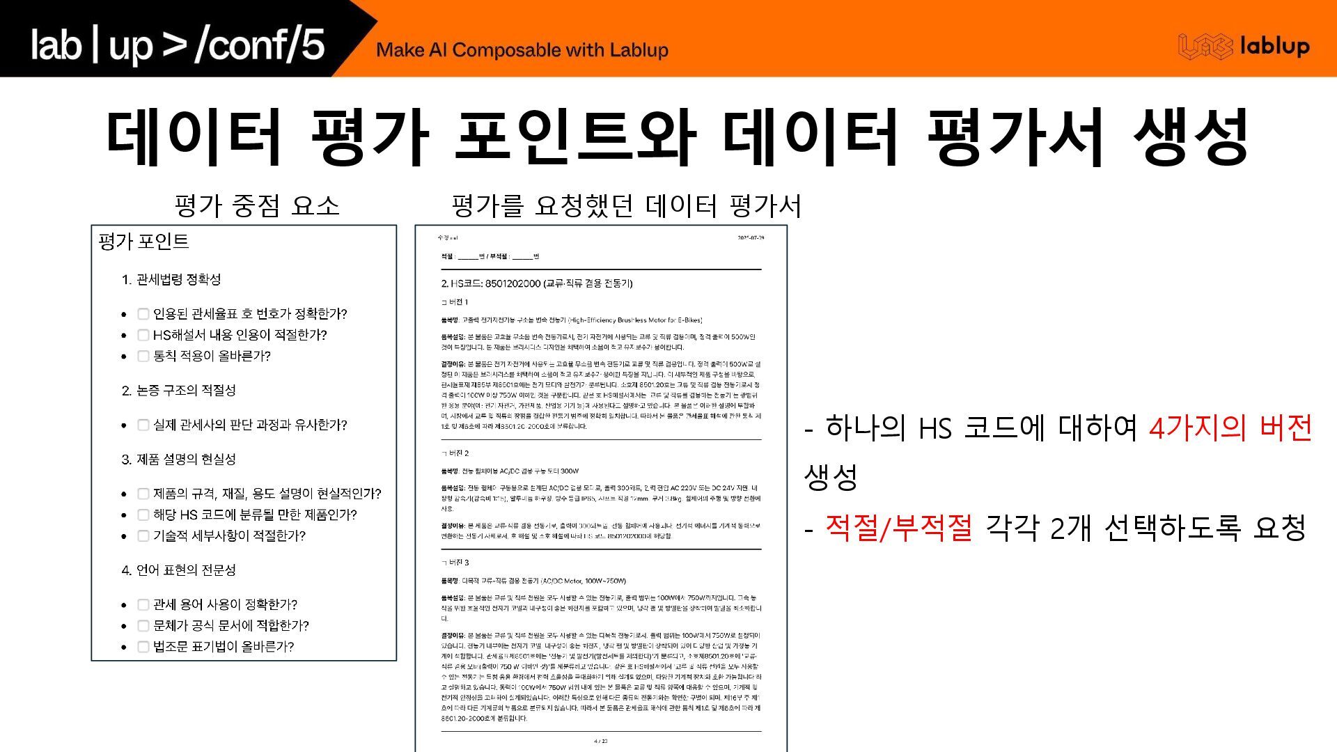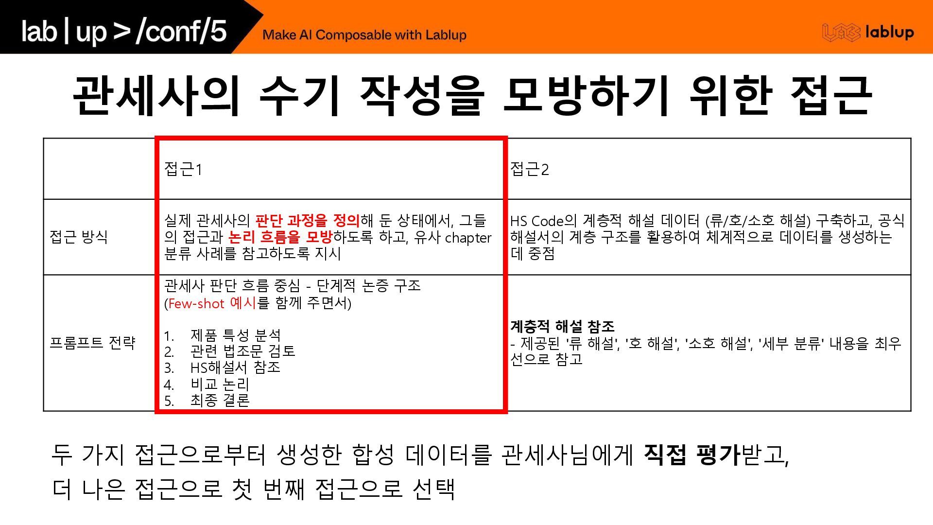 실제 관세사의 판단 과정을 정의해 둔 상태에서, 그들 의 접근과 논리 흐름을 모방하도록 하고, 유사 chapter 분류 사례를 참고하도록 지시 HS Code의 계층적 해설 데이터 (류/호/소호 해설) 구축하고, 공식 해설서의 계층 구조를 활용하여 체계적으로 데이터를 생성하는 데 중점 프롬프트 전략 관세사 판단 흐름 중심 - 단계적 논증 구조 (Few-shot 예시를 함께 주면서) 1. 제품 특성 분석 2. 관련 법조문 검토 3. HS해설서 참조 4. 비교 논리 5. 최종 결론 계층적 해설 참조 - 제공된 '류 해설', '호 해설', '소호 해설', '세부 분류' 내용을 최우 선으로 참고 두 가지 접근으로부터 생성한 합성 데이터를 관세사님에게 직접 평가받고, 더 나은 접근으로 첫 번째 접근으로 선택