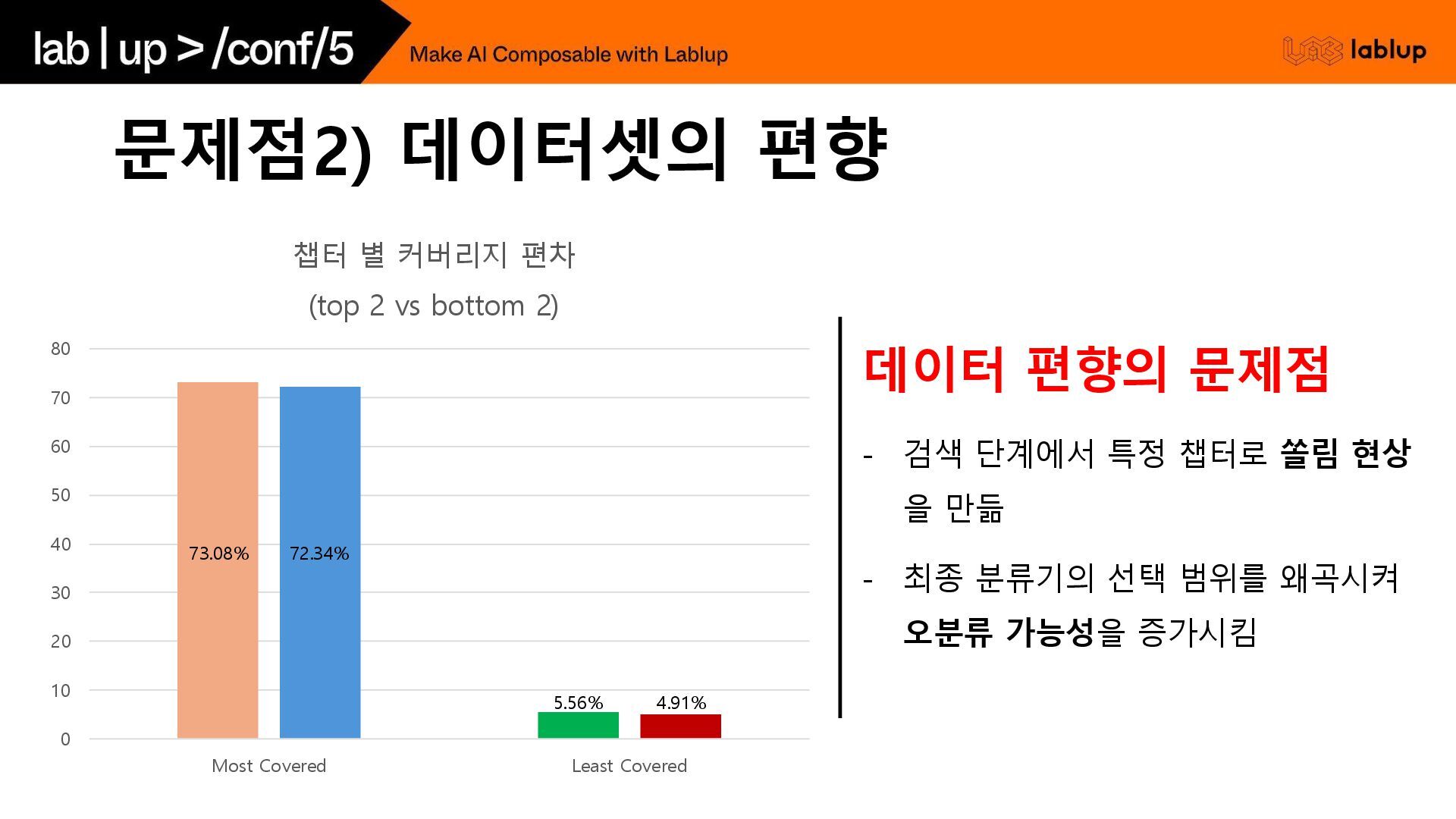 챕터로 쏠림 현상 을 만듦 - 최종 분류기의 선택 범위를 왜곡시켜 오분류 가능성을 증가시킴 0 10 20 30 40 50 60 70 80 Most Covered Least Covered 챕터 별 커버리지 편차 (top 2 vs bottom 2) 5.56% 4.91% 72.34% 73.08%