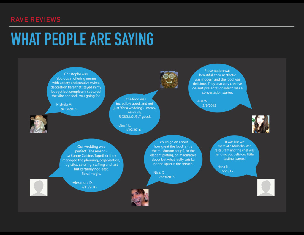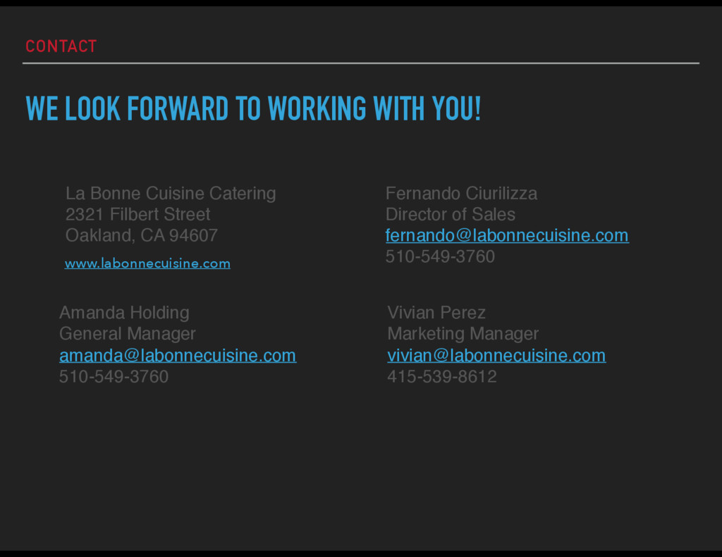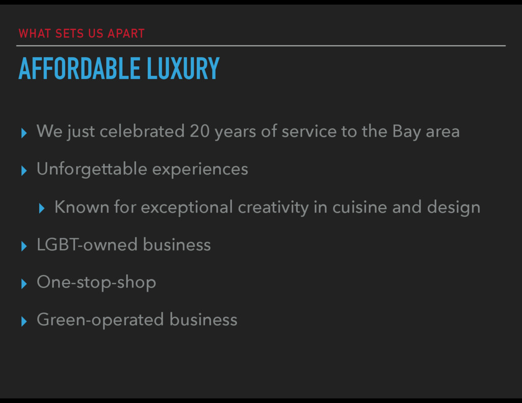 20 years of service to the Bay area ▸ Unforgettable experiences ▸ Known for exceptional creativity in cuisine and design ▸ LGBT-owned business ▸ One-stop-shop ▸ Green-operated business